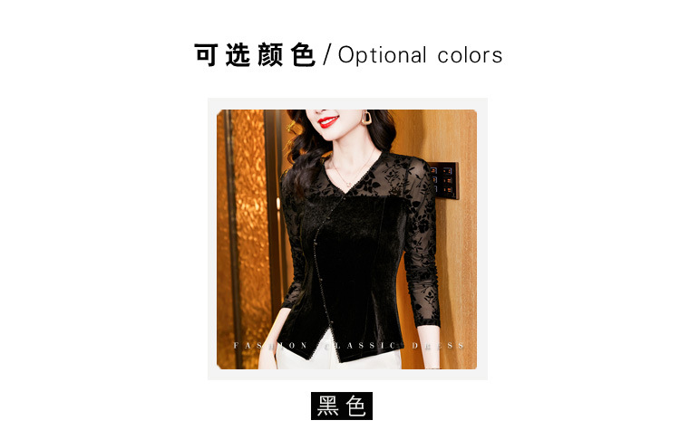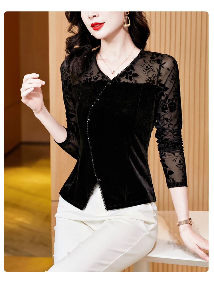 KQL E37M2920气质V领丝绒拼接植绒网纱长袖打底t恤