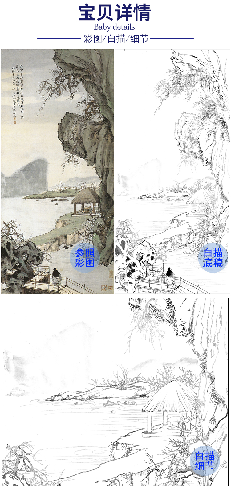 竖幅工笔画山水人物白描底稿-金城-《湖中赏梅图》-多种白描尺寸可选-JS04