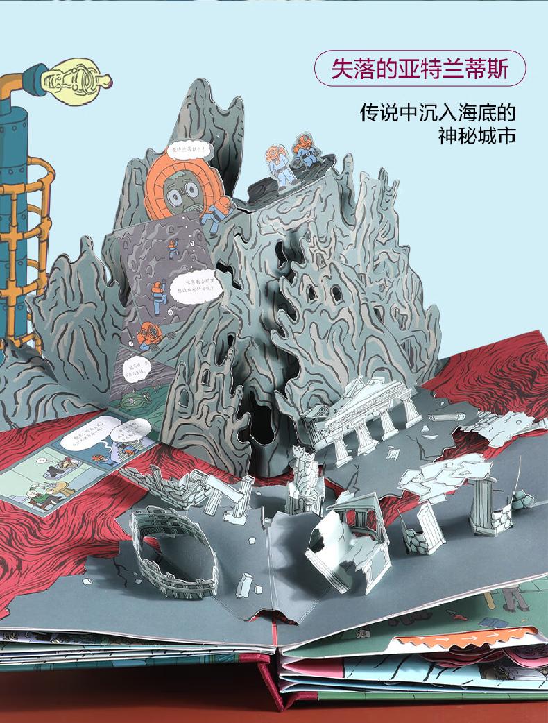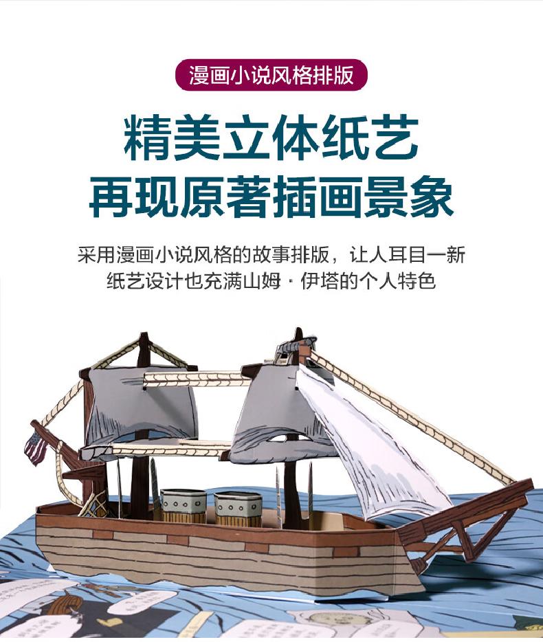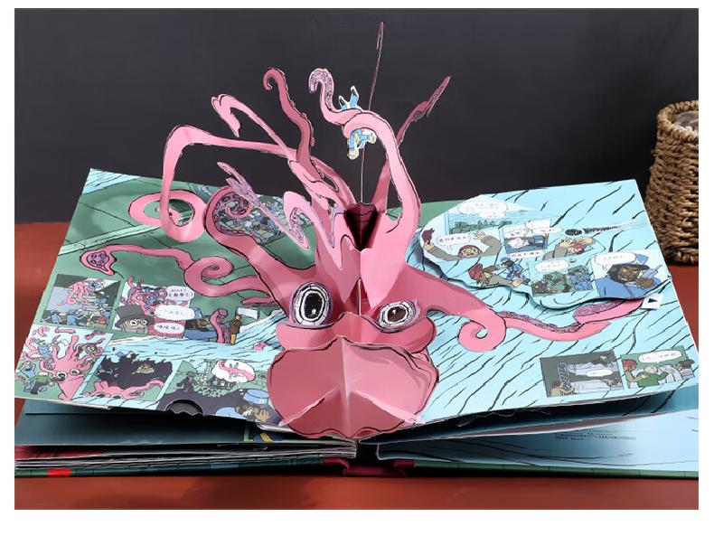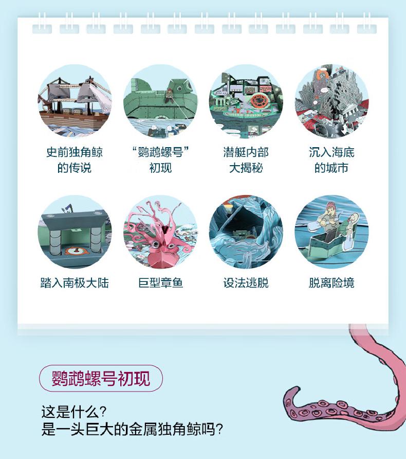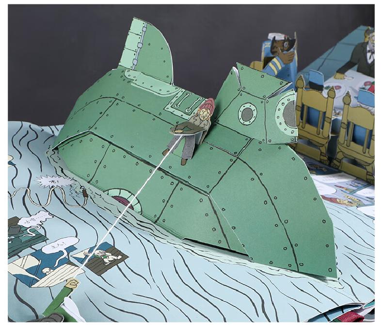 这本书是法国“科幻小说之父”儒勒·凡尔纳的代表作《海底两万里》的立体版,纸艺设计者为美国艺术家山姆·伊塔。山姆通过精心挑选并创作的八个场景,包括史前独角鲸的传说、鹦鹉螺号初现、教授及随从被抓进潜艇内部、沉入海底城市、踏上南大陆、巨型章鱼、设法逃脱、脱离险境,并将立体结构和漫画形式合二为一,展现了一个独特的远洋航行和海底世界。