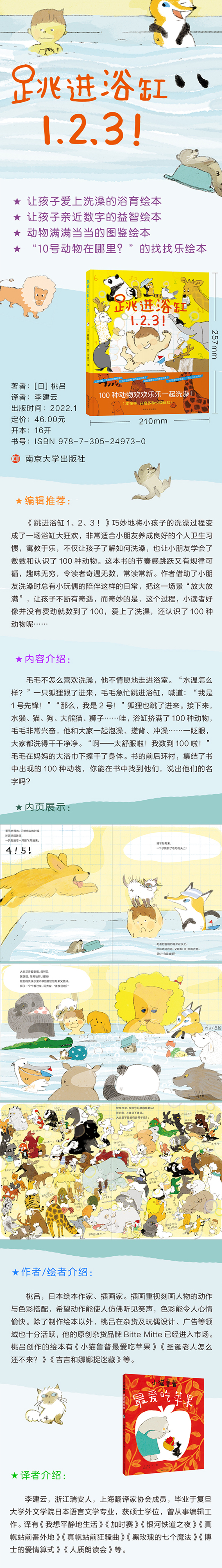 毛毛不怎么喜欢洗澡,他不情愿地走进浴室。“水温怎么样?”一只狐狸跟了进来,毛毛急忙跳进浴缸,喊道:“我是1号先锋!”“那么,我是2号!”狐狸也跳了进来。接下来,水獭、猫、狗、大熊猫、狮子……哇,浴缸挤满了100种动物,毛毛非常兴奋,他和大家一起泡澡、搓背、冲澡……一眨眼,大家都洗得干干净净。“啊——太舒服啦!我数到100啦!” 毛毛在妈妈的大浴巾下擦干了身体。书的前后环衬,集结了书中出现的100种动物,你能在书中找到他们,说出他们的名字吗?
