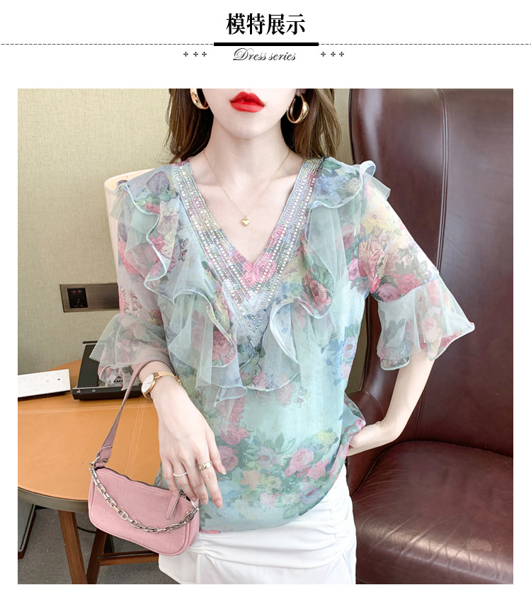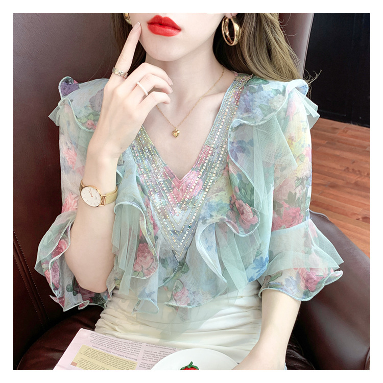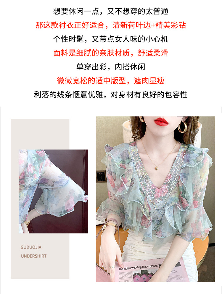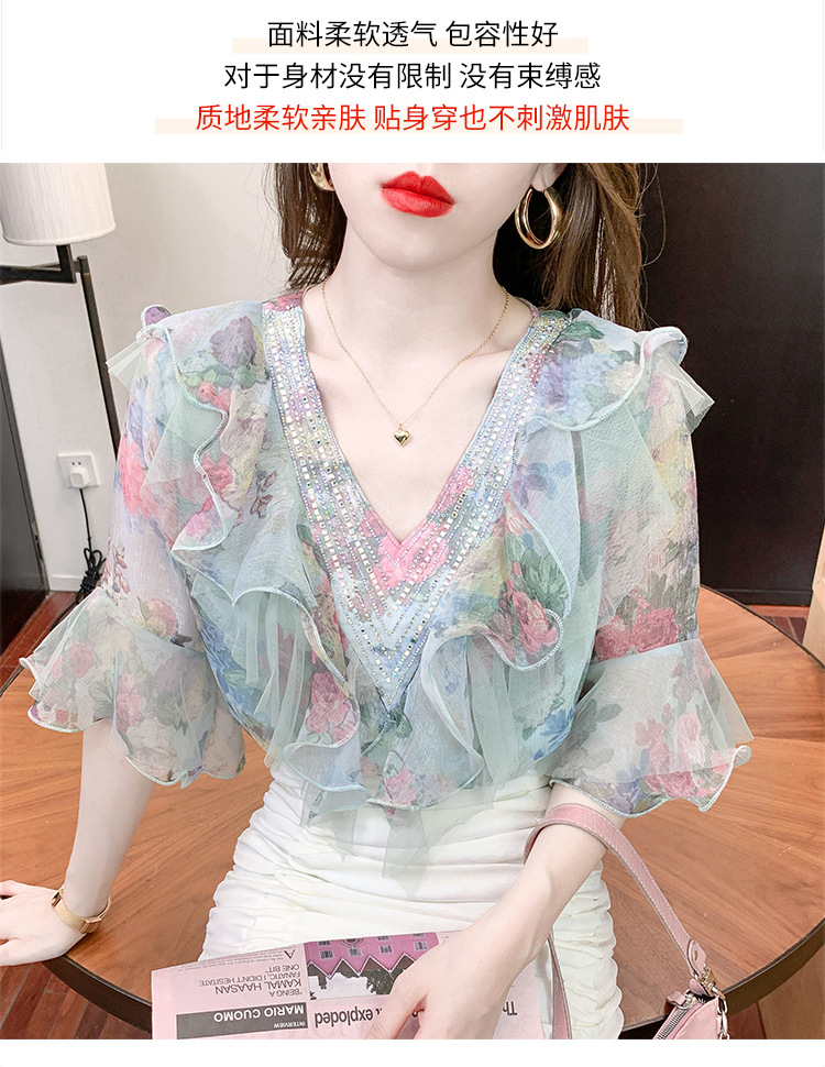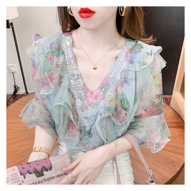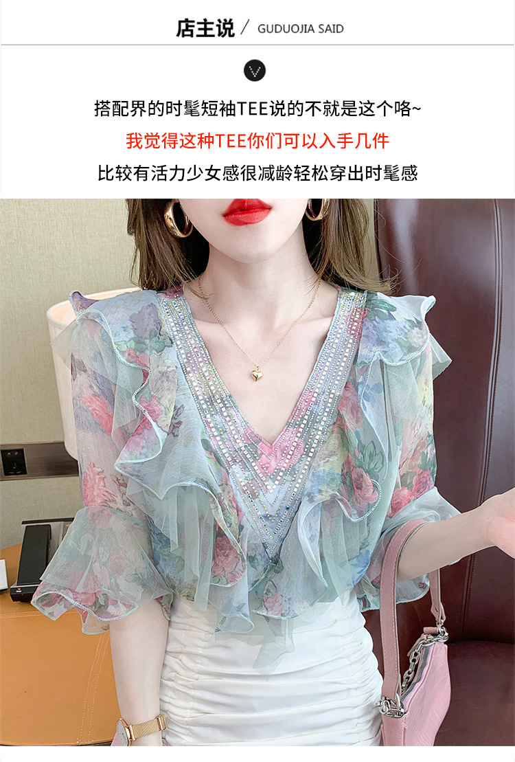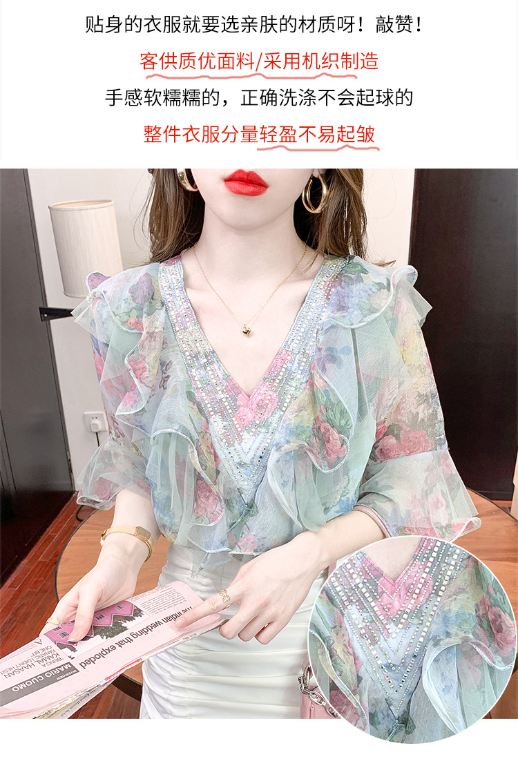 优雅百搭,荷叶边雪纺衬衫V领烫钻感短袖碎花上衣SDJ27241157