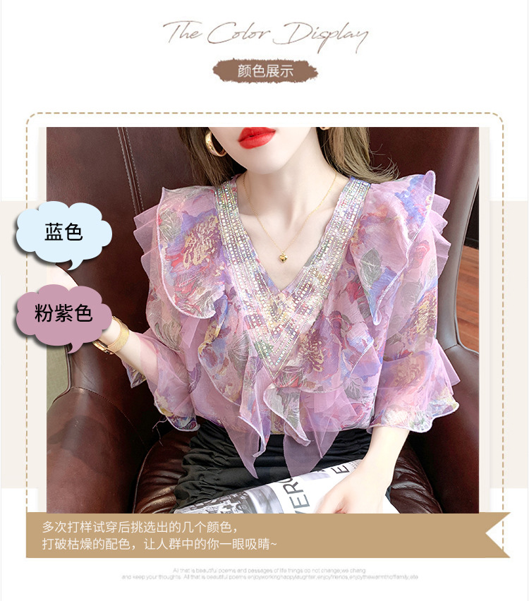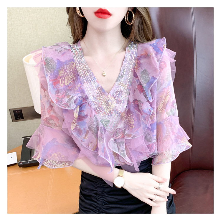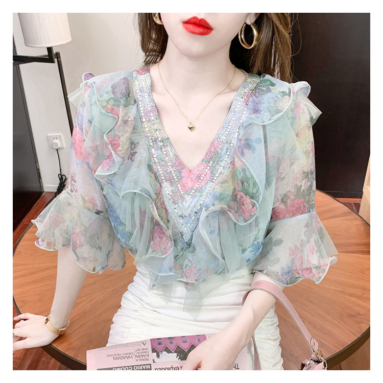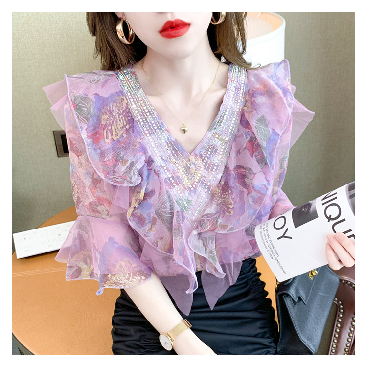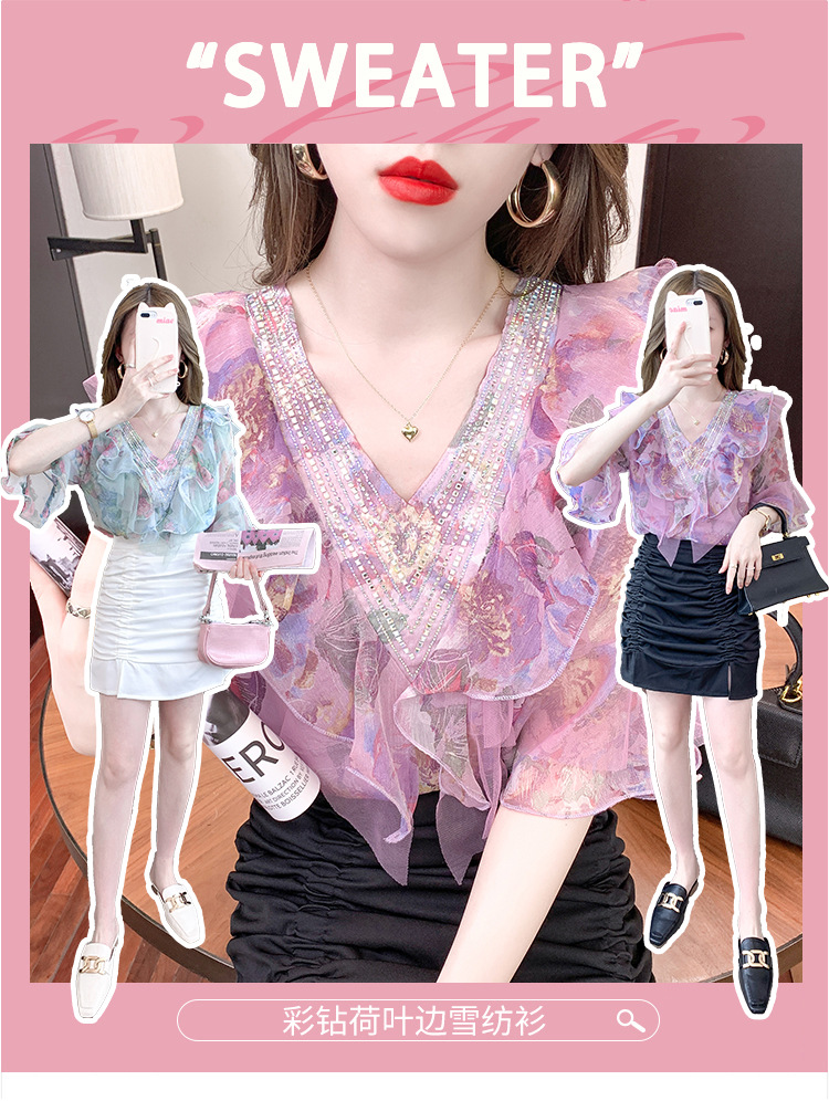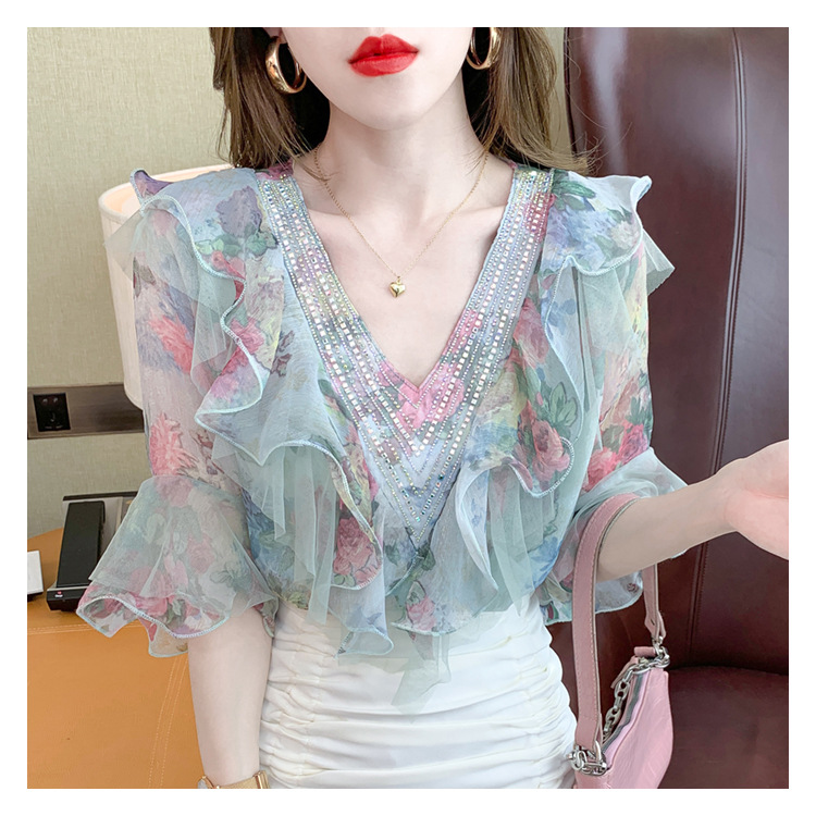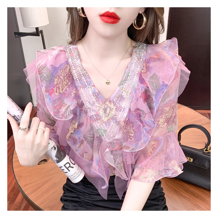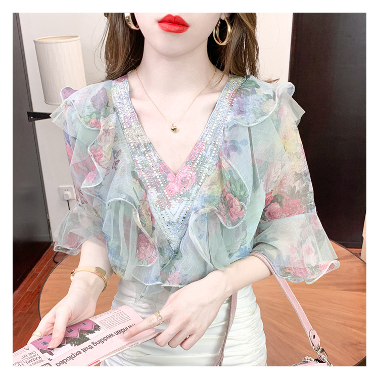 优雅百搭,荷叶边雪纺衬衫V领烫钻感短袖碎花上衣SDJ27241157