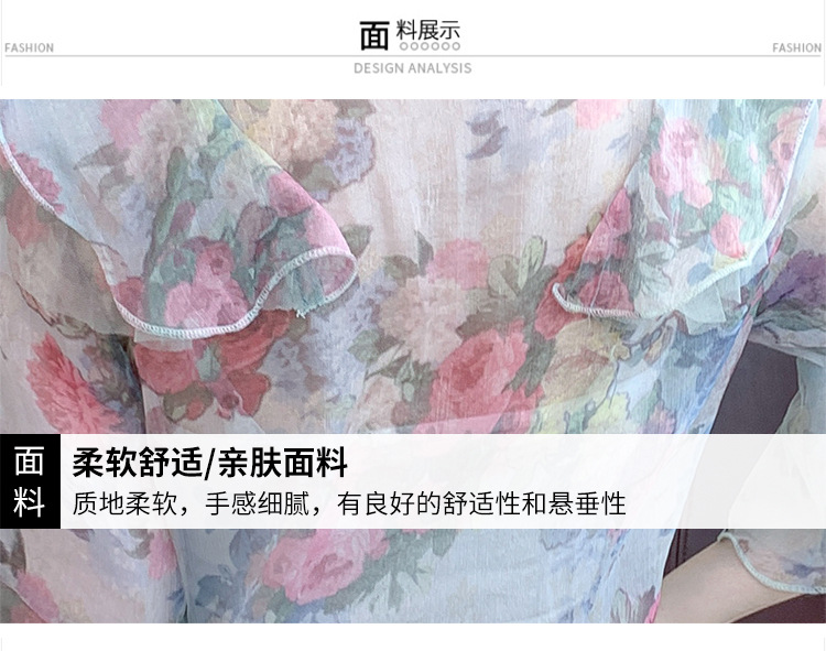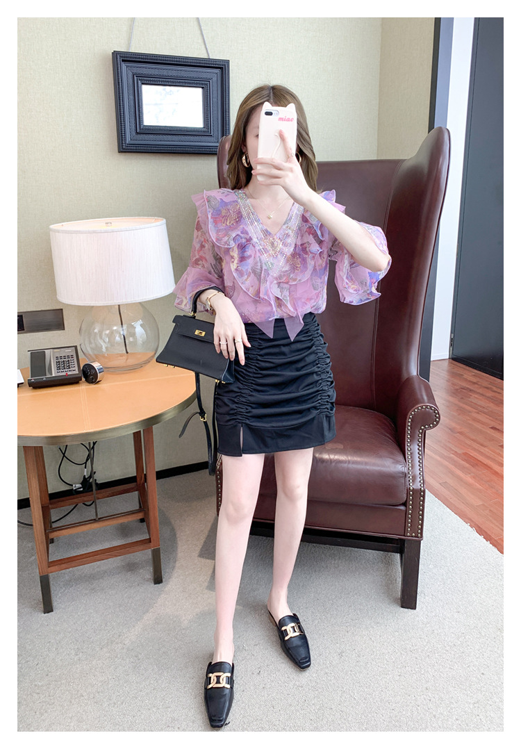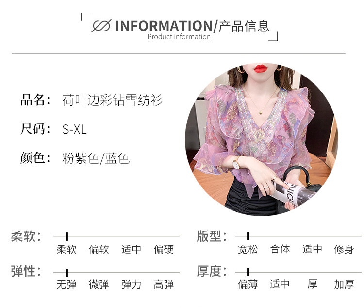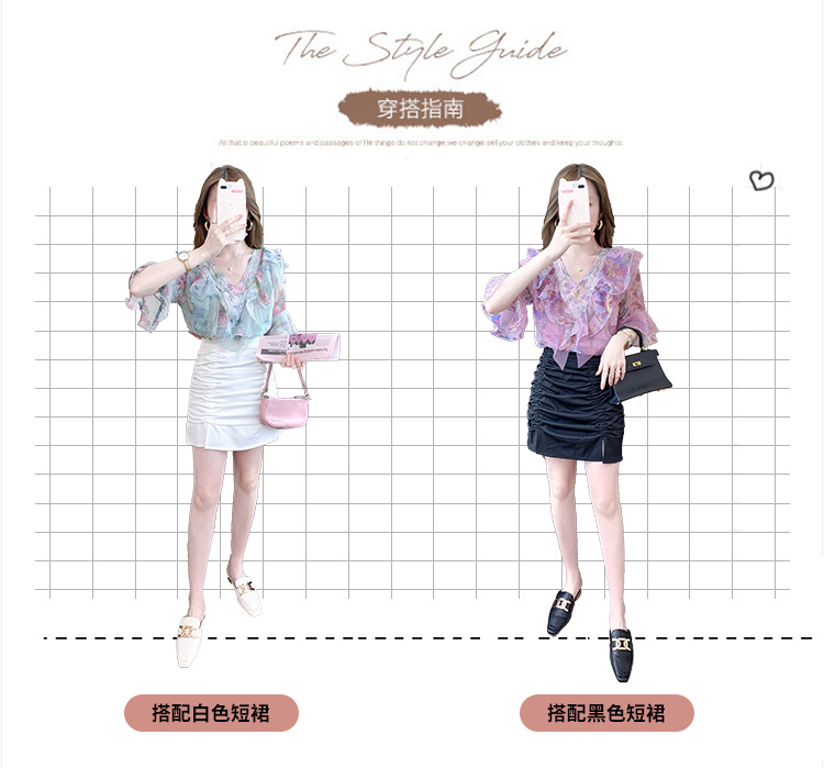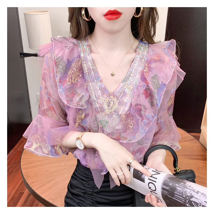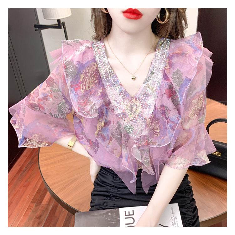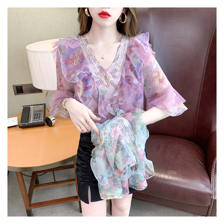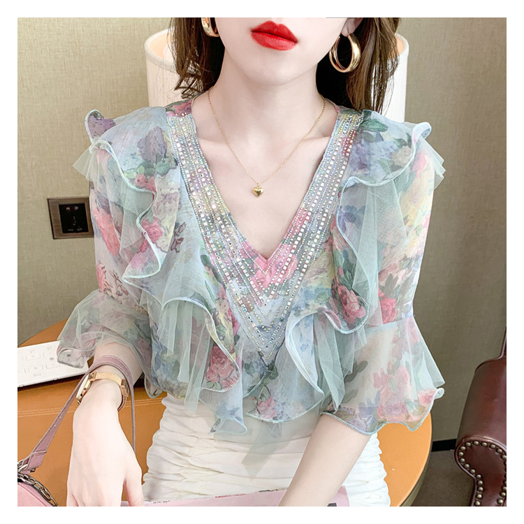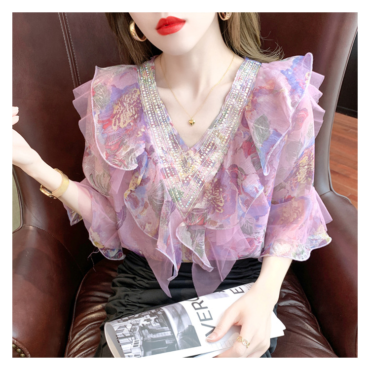 优雅百搭,荷叶边雪纺衬衫V领烫钻感短袖碎花上衣SDJ27241157