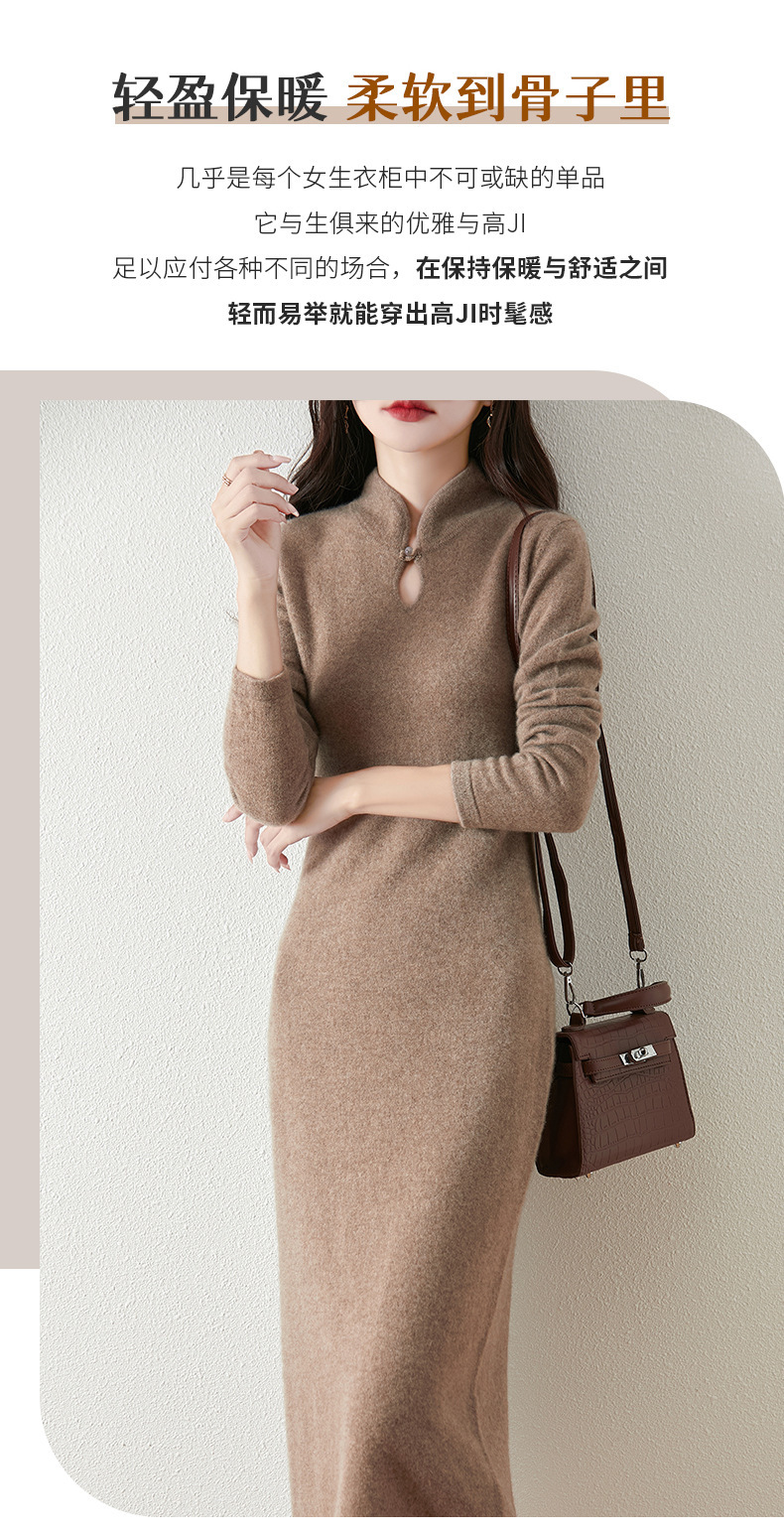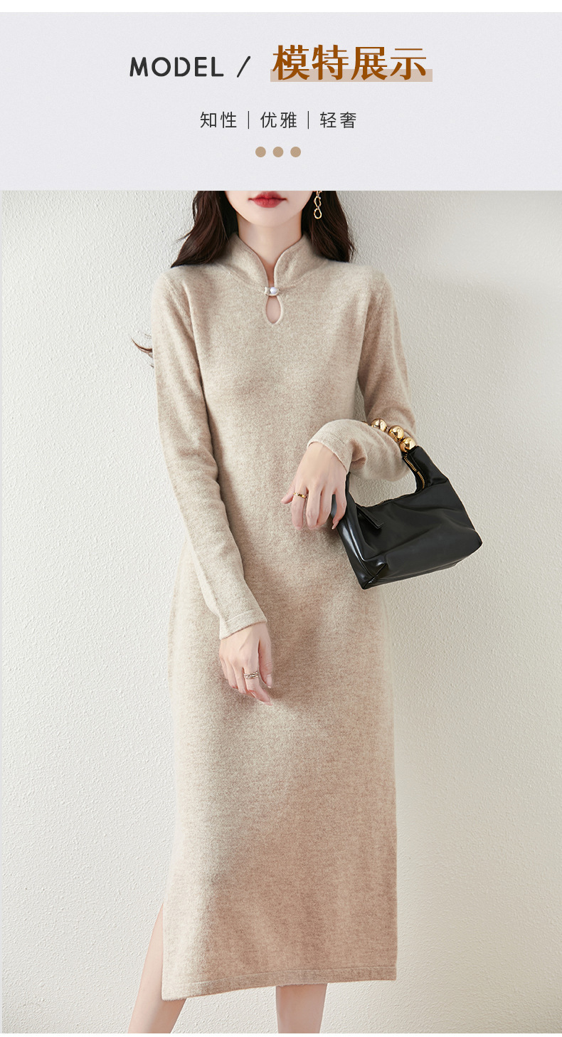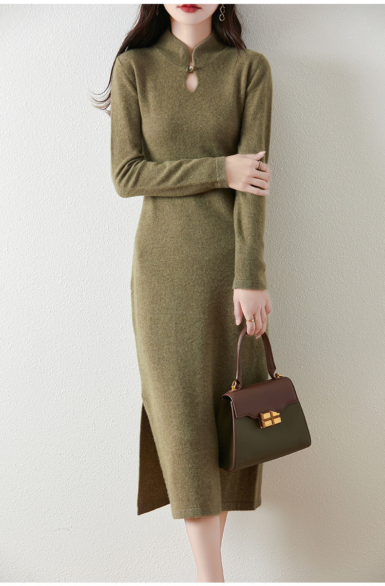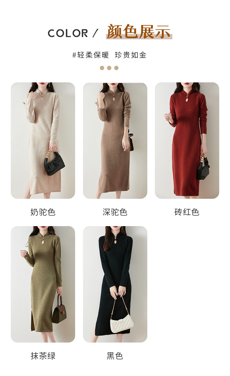 新中式气质国风,时尚开叉打底长裙纯羊毛针织连衣裙Y2470