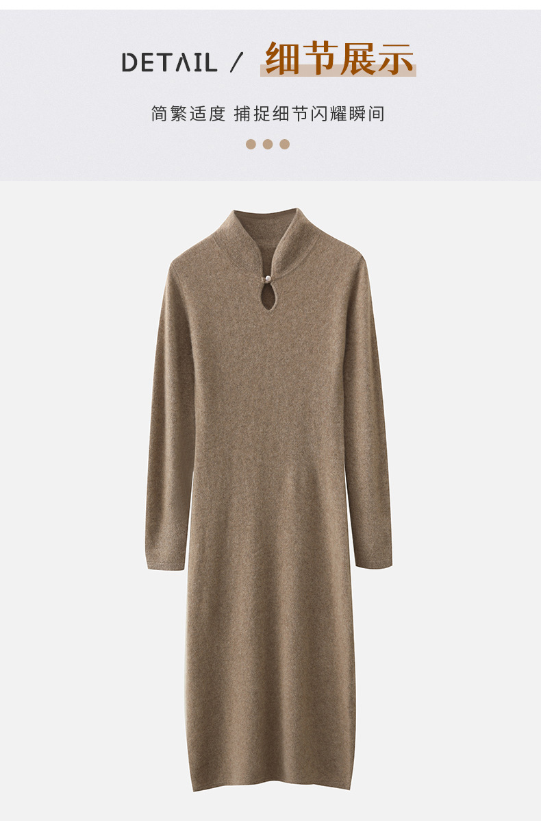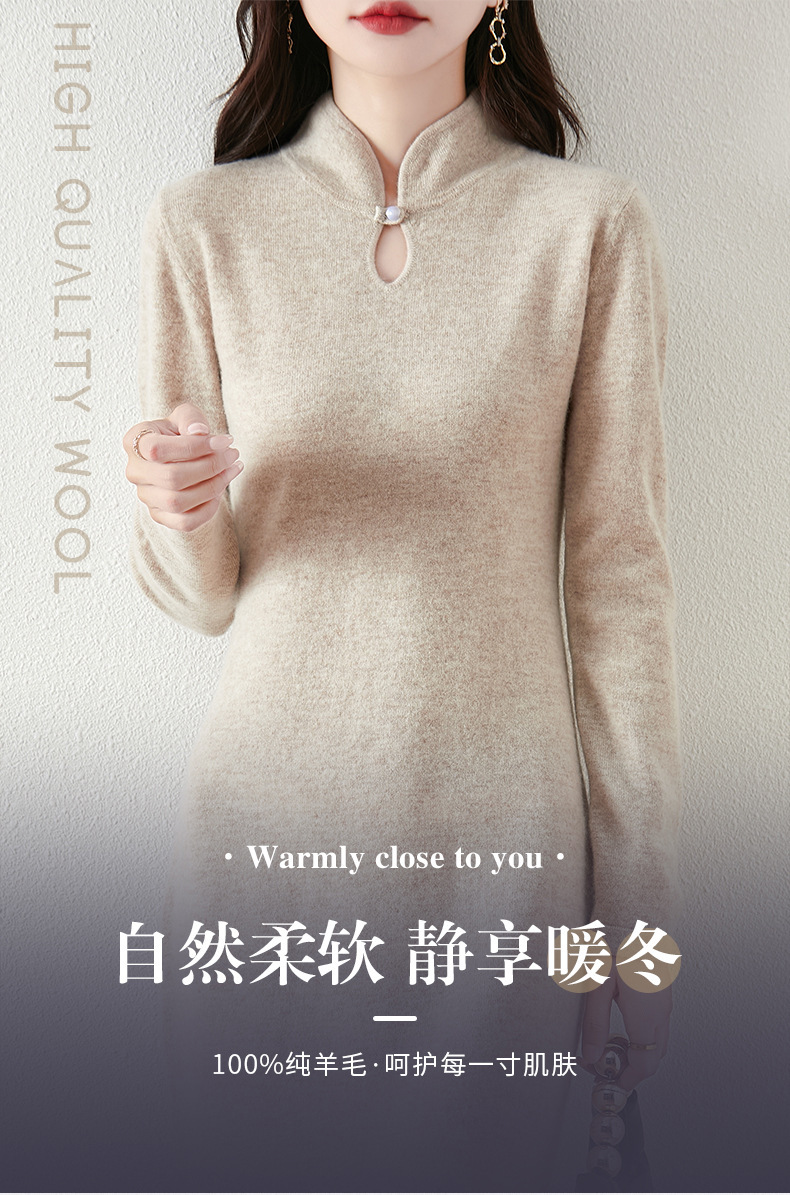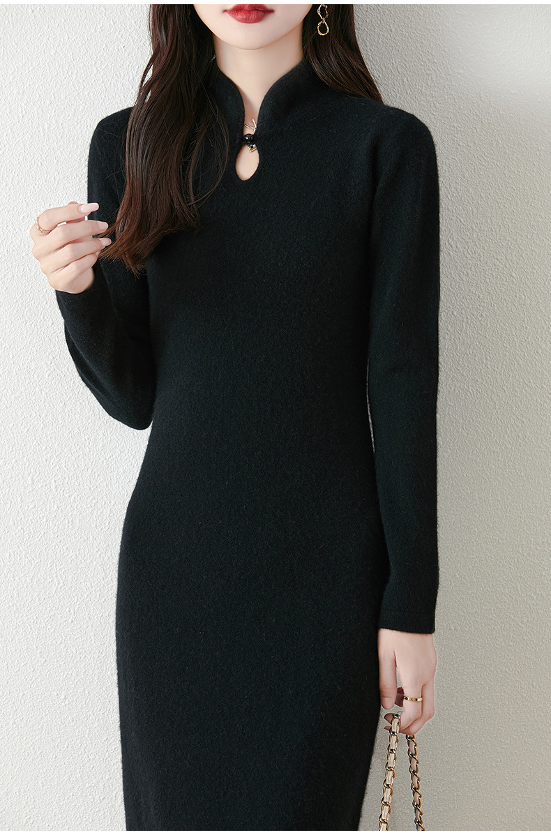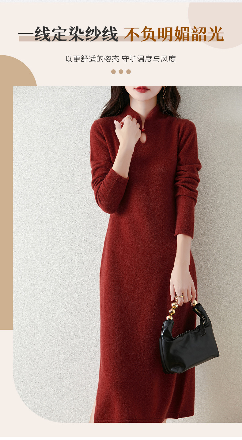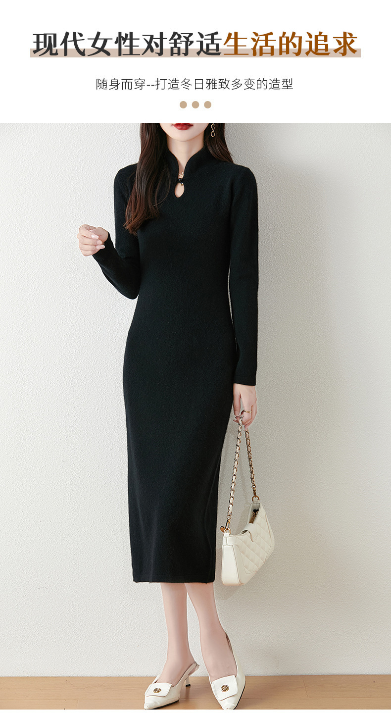 新中式气质国风,时尚开叉打底长裙纯羊毛针织连衣裙Y2470