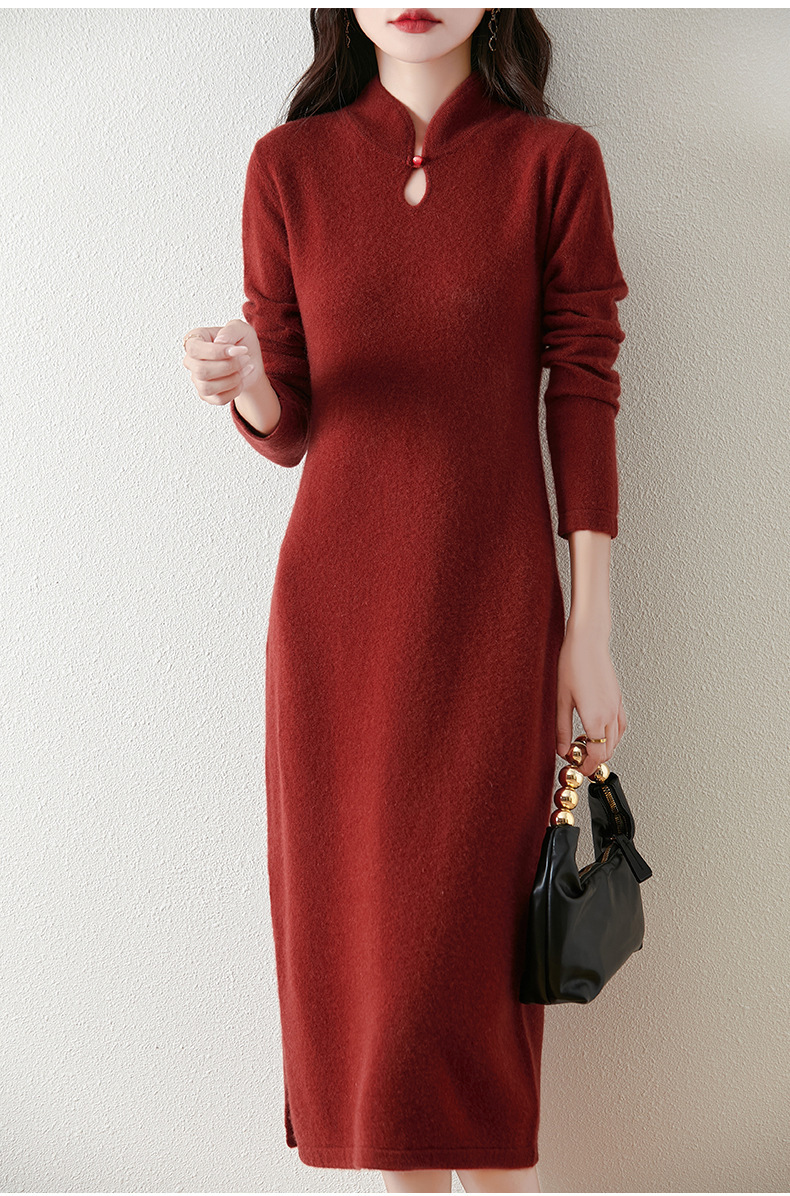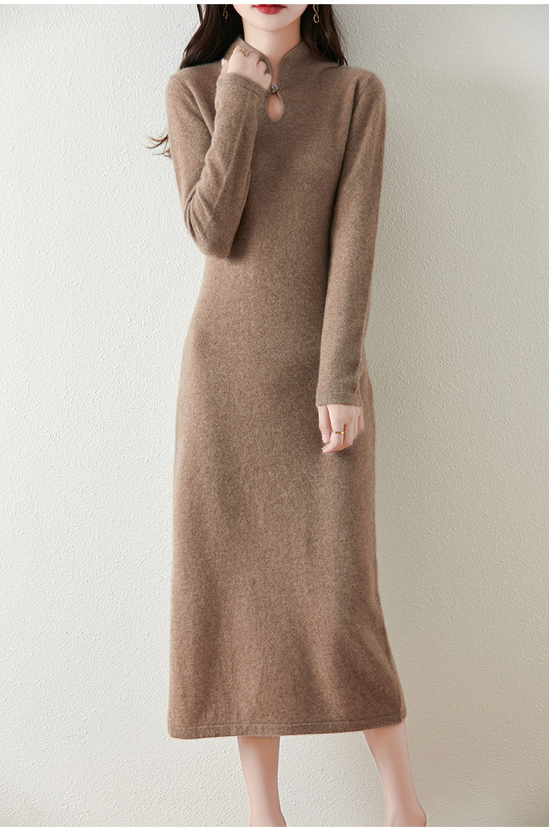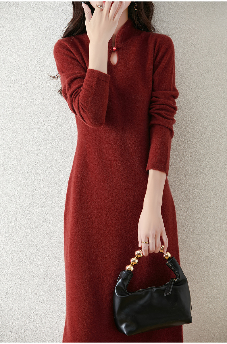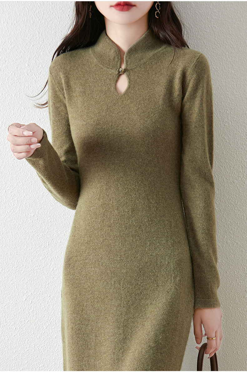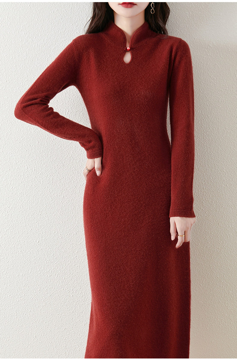 新中式气质国风,时尚开叉打底长裙纯羊毛针织连衣裙Y2470
