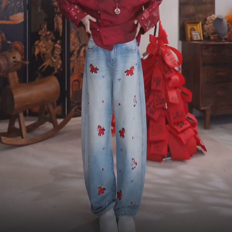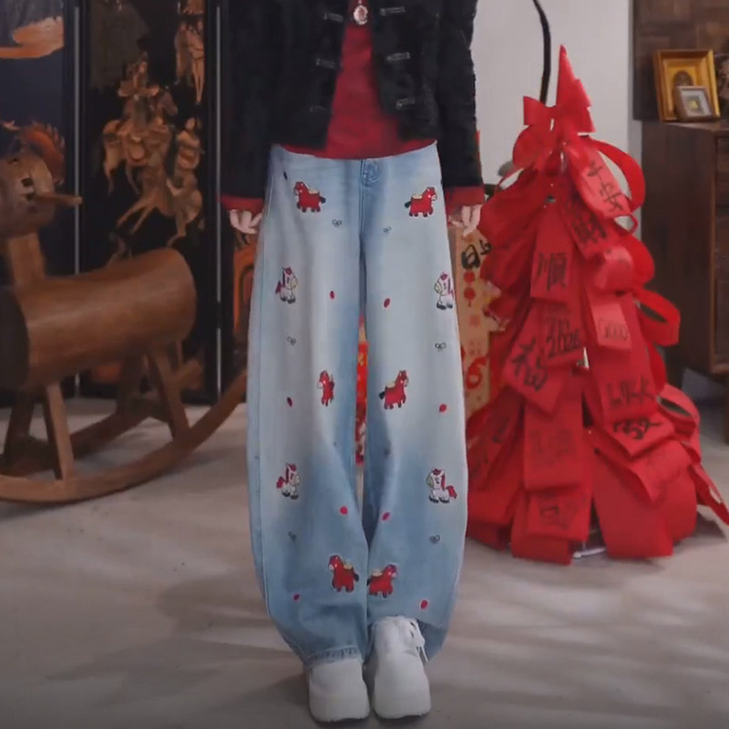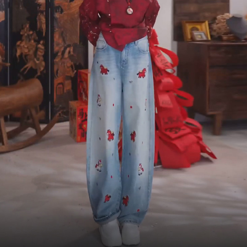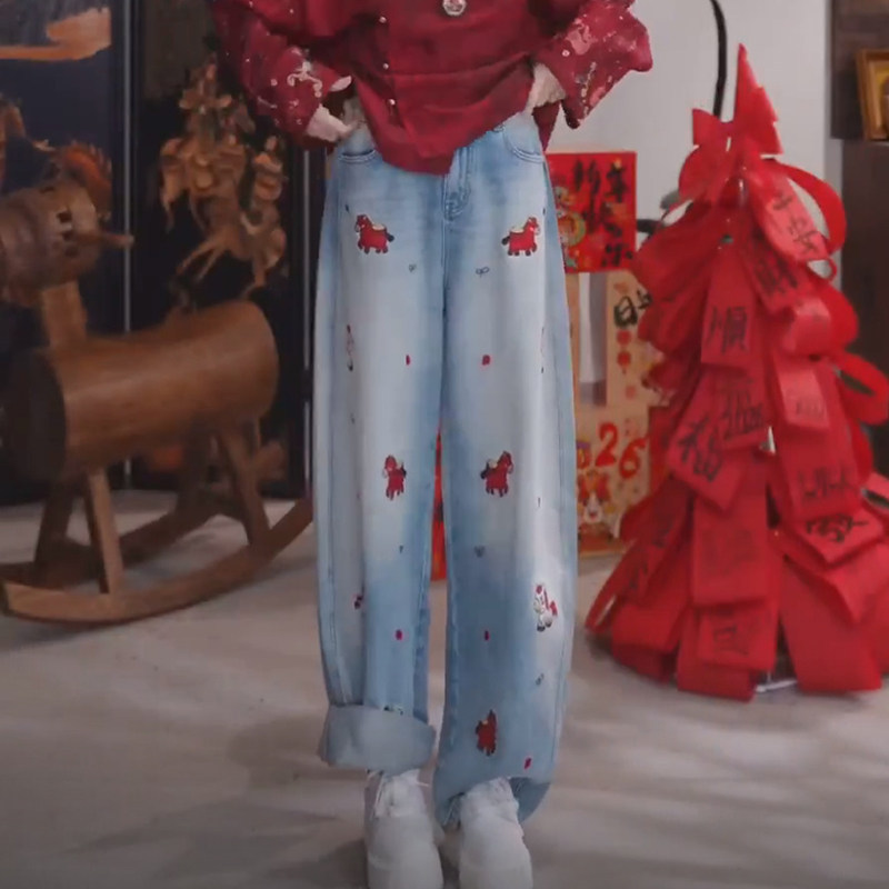 丁摩 马上有钱刺绣牛仔裤女春冬新款高腰宽松阔脚裤休闲拖地长裤5ZF-117