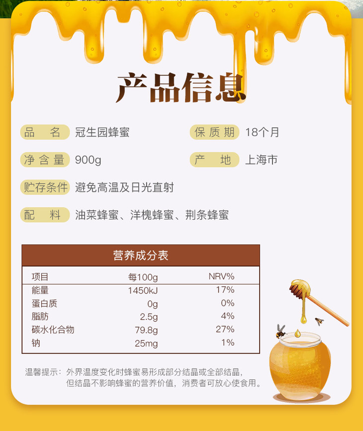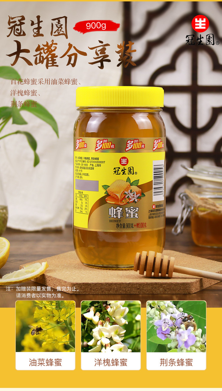 【礼遇国庆】900g 上海 冠生园 纯蜂蜜 清香温润,滋养消疲,健康甜蜜