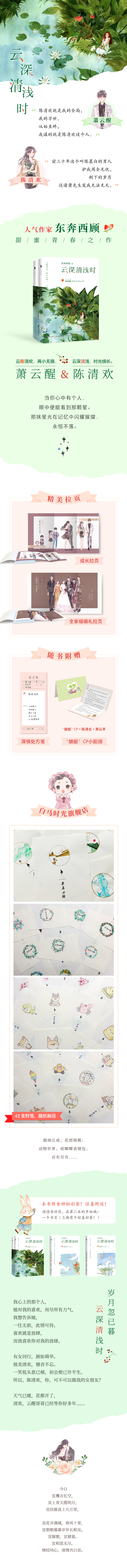☆《云深清浅时》是东奔西顾自《你是我的小确幸》后历时三年写就。讲述了陈慕白和顾九思之女陈清欢与萧子渊和随忆之子萧云醒的故事。从中学开始写起,穿插青梅竹马的小时候,再到大学篇和职场篇。