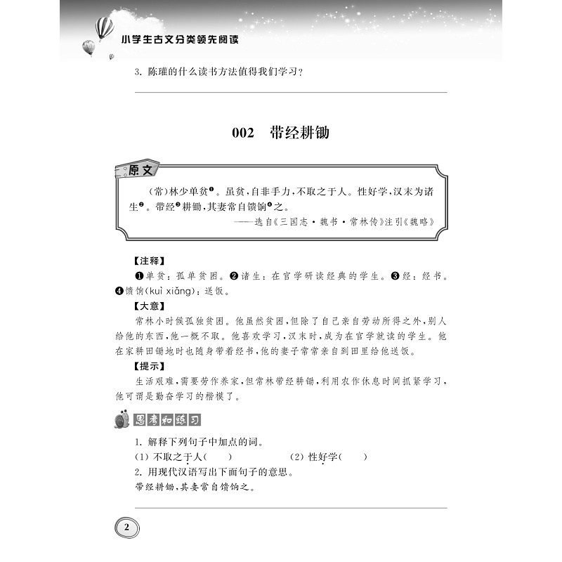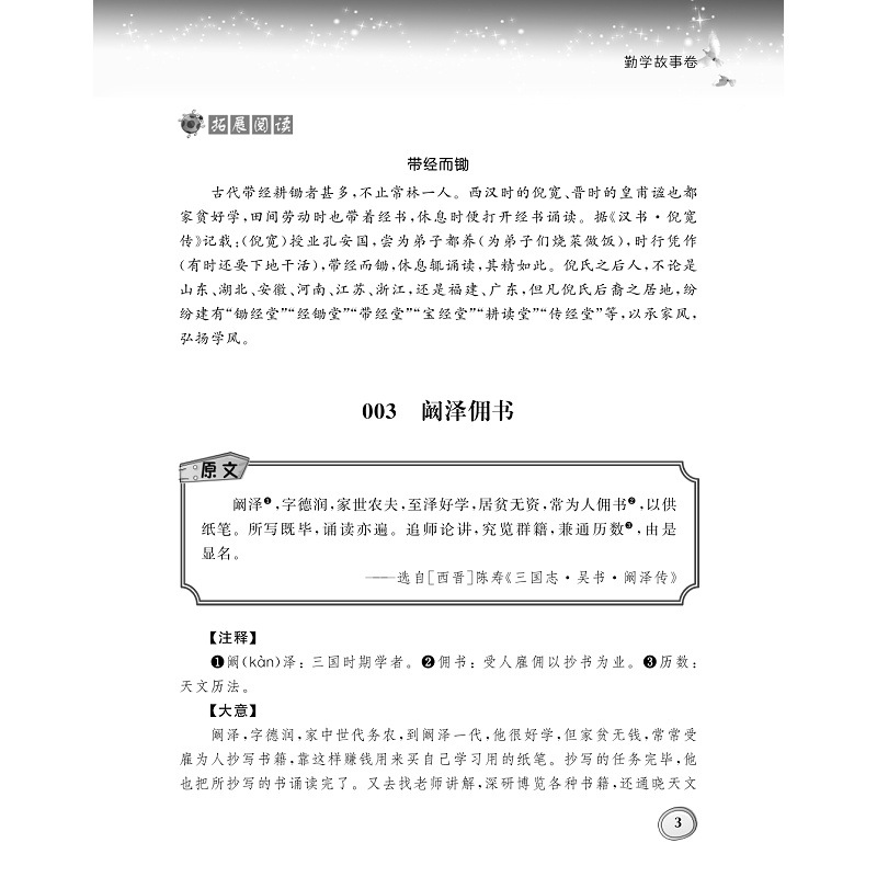 书稿内容精选我国古代人物的勤学故事,对重难点词句用现代汉语作出解释,辅助学生阅读。翻译以直译为主,语言活泼,浅显易懂。注重语感培养,简单的文言知识积累,以及阅读能力的培养。适合小学中、高年级学生课外阅读使用。