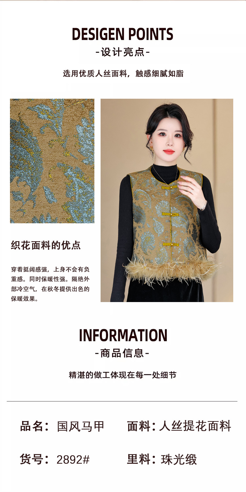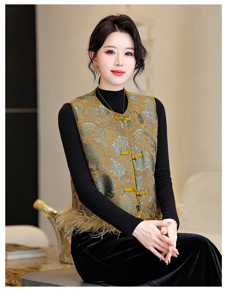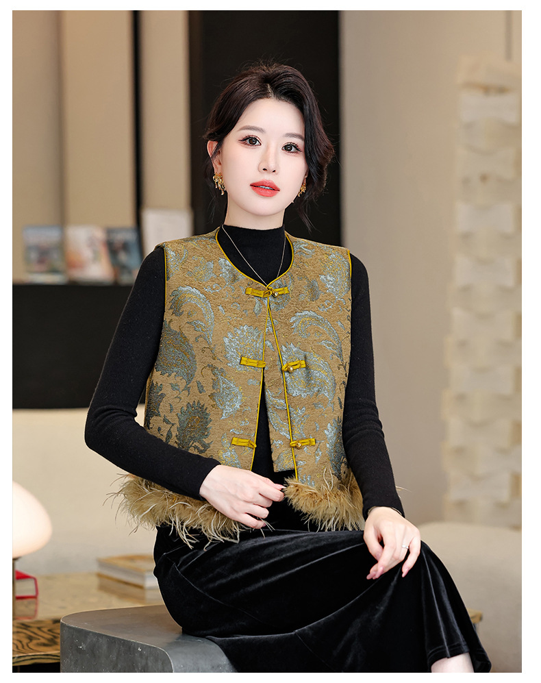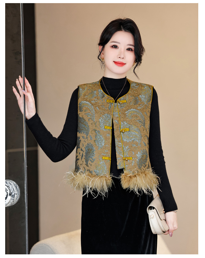 KQL422H2892 2025秋新款女复古背心百搭显瘦气质马夹新中式国风鸵鸟羽毛潮马甲
