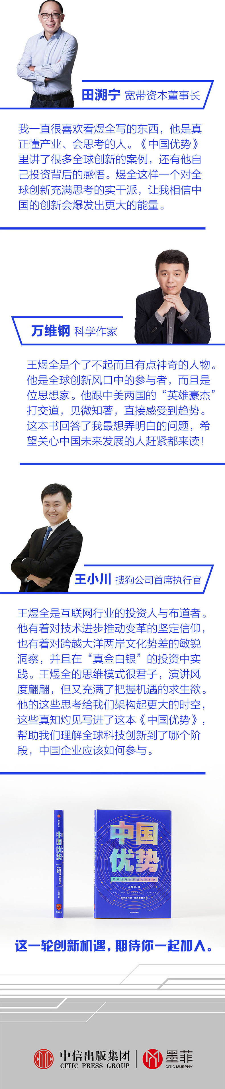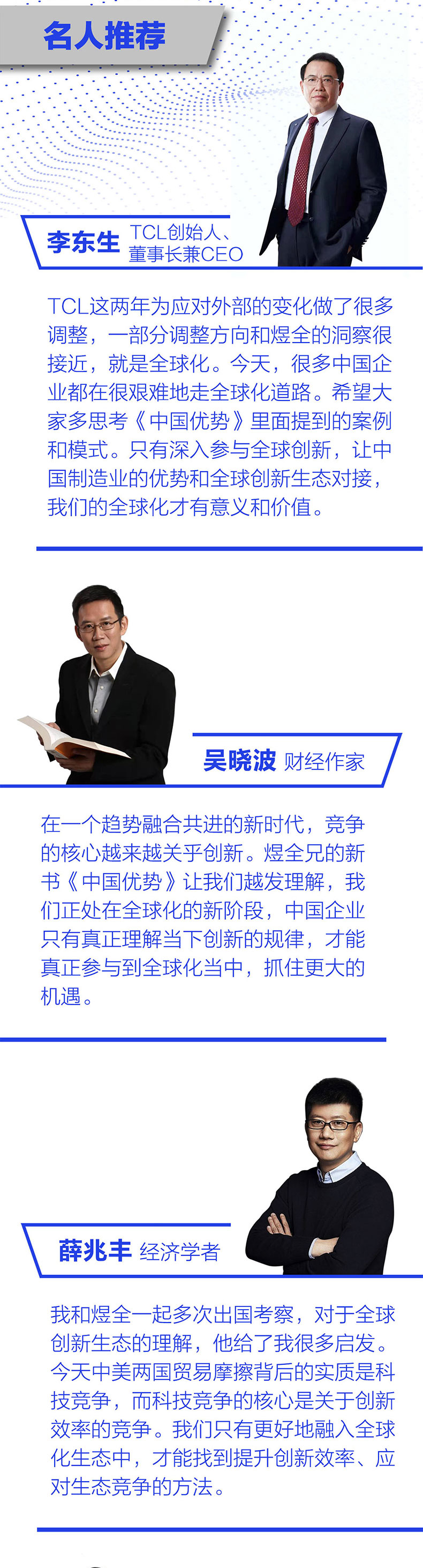 我一直很喜欢看煜全写的东西,他是真正懂产业、会思考的人。《中国优势》里讲了很多全球创新的案例,还有他自己投资背后的感悟。煜全这样一个对全球创新充满思考的实干派,让我相信中国的创新会爆发出更大的能量。