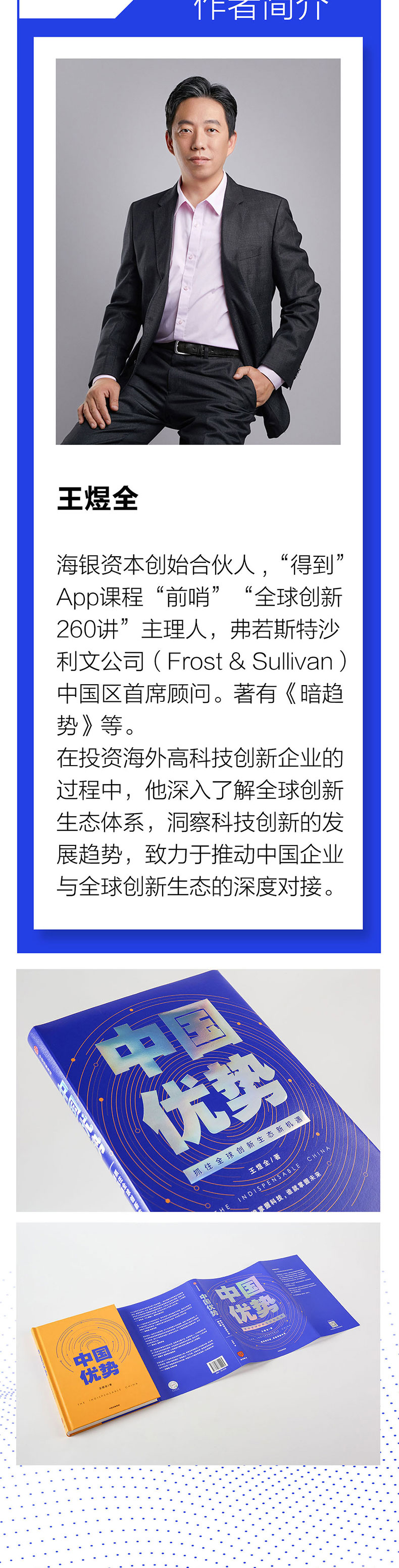 王煜全是互联网行业的投资人与布道者。他有着对技术进步推动变革的坚定信仰,也有着对跨越大洋两岸文化势差的敏锐洞察,并且在“真金白银”的投资中实践。王煜全的思维模式很君子,演讲风度翩翩,但又充满了把握机遇的求生欲。他的这些思考给我们架构起更大的时空,这些真知灼见写进了这本《中国优势》,帮助我们理解全球科技创新到了哪个阶段,中国企业应该如何参与。