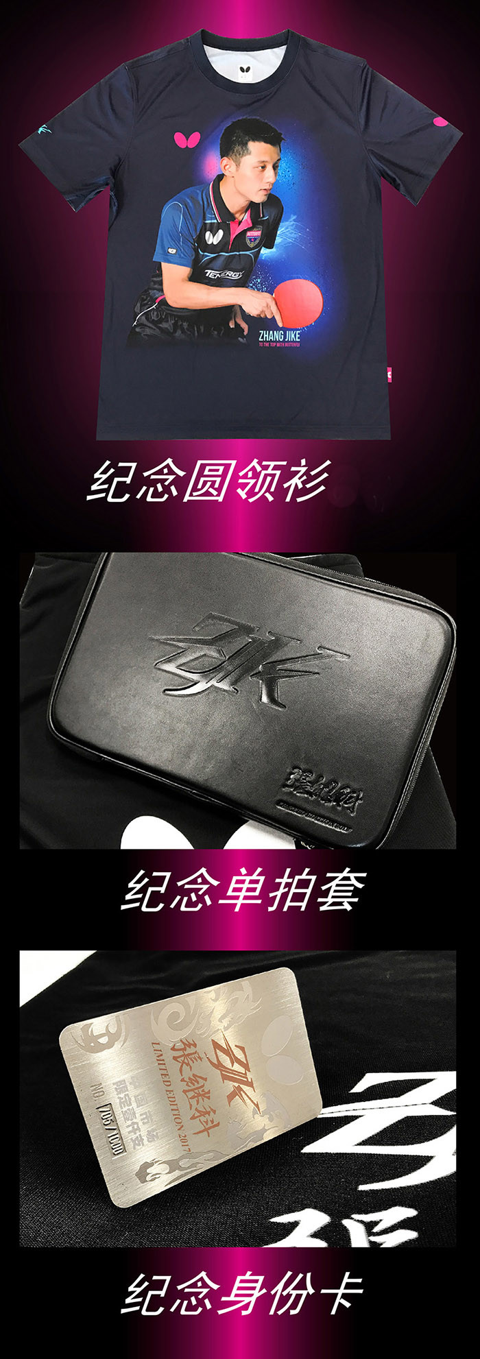 简介:蝴蝶BUTTERFLY 张继科系列底板一直以来深受广大球友追捧,此款限量纪念版礼盒套装更是大有收藏价值,礼盒内含张继科限量球拍一只(横板)、真皮单拍套一个、纪念圆领衫一件、纪念册一本、纪念身份卡一张。如此规模的礼盒着实让人心动,拥有这样一款全套礼盒足以在球友中身价倍增。
