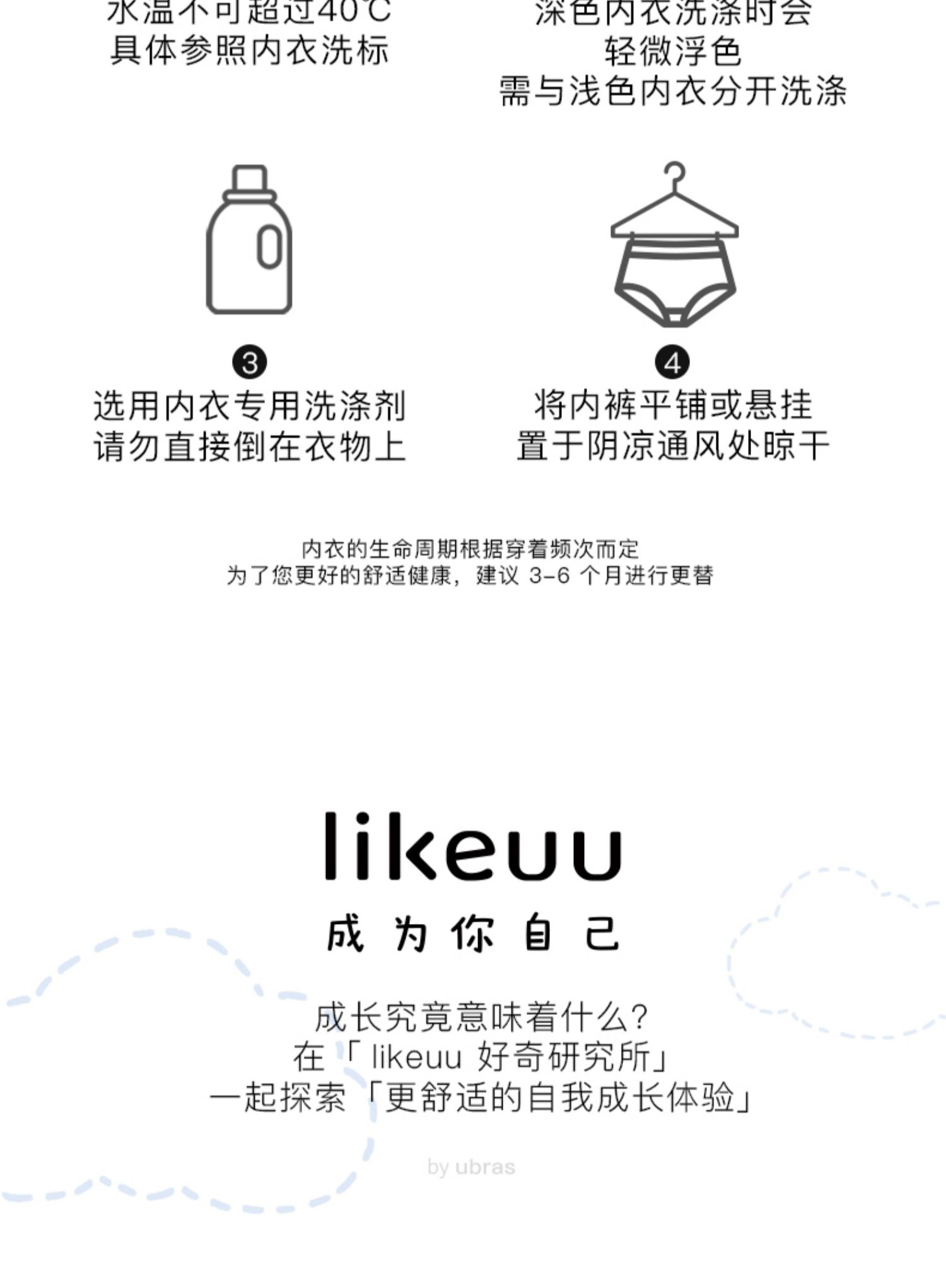 - likeuu是专注于为6~15岁的青少年创造柔软、无束缚的成长体验,以好奇心为灵感的成长发育期贴身衣物品牌。likeuu的产品覆盖内衣、内裤、保暖衣、家居服、运动等品类。