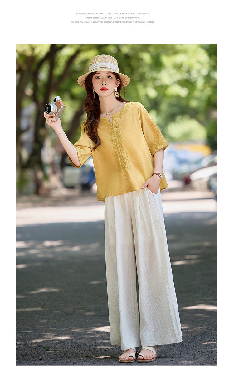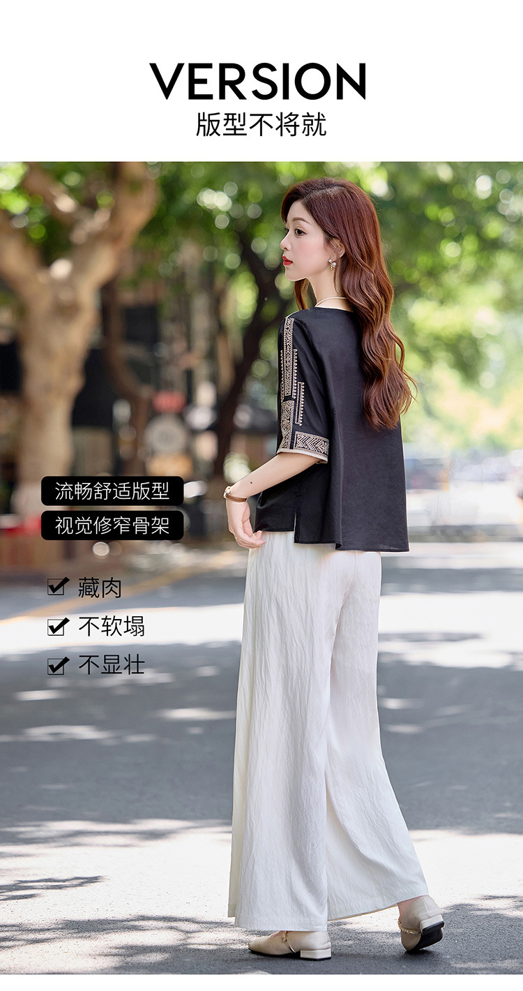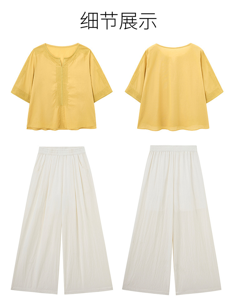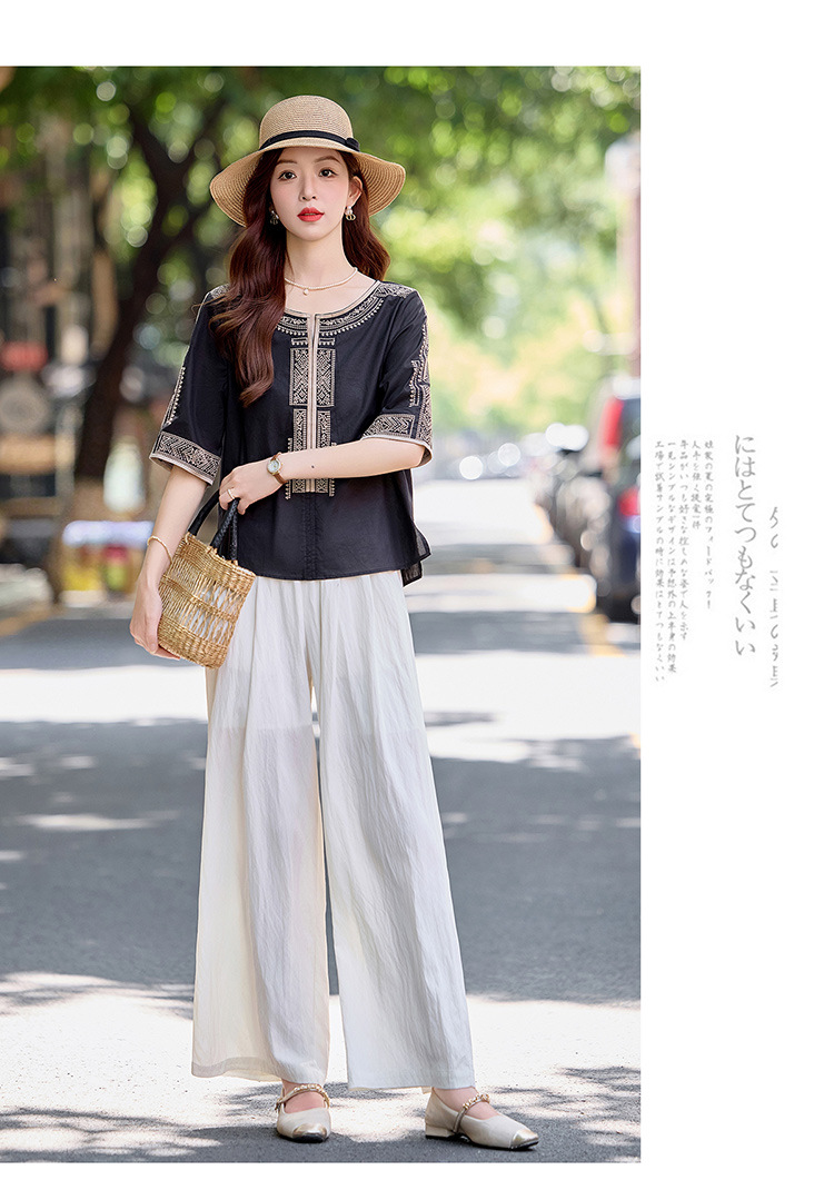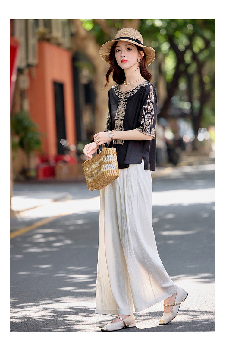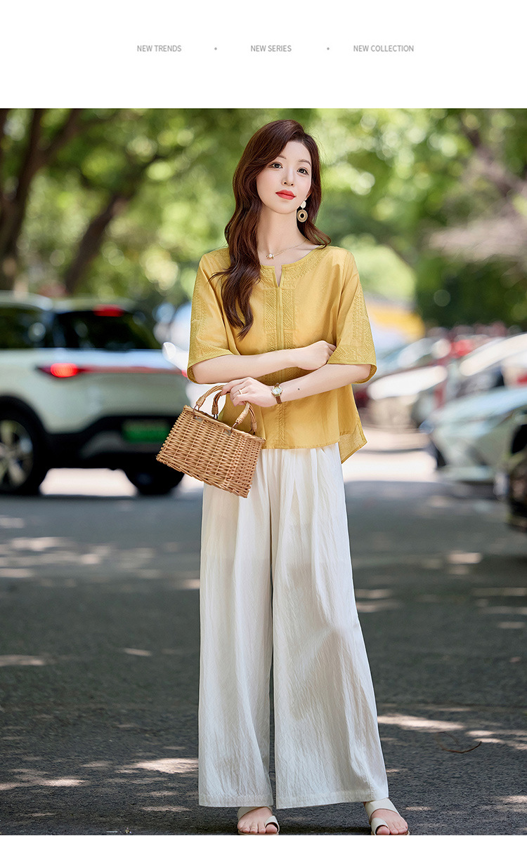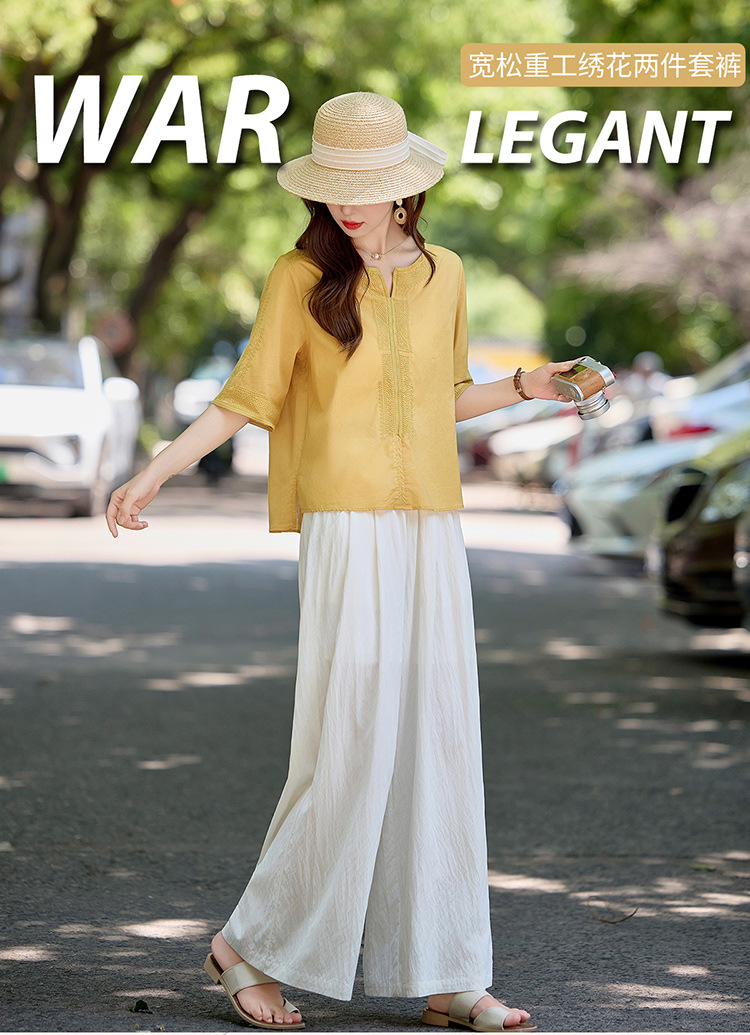 YLFS9015夏季新款棉麻套装女印花上衣坠感阔腿裤两件套宽松显瘦遮肉休闲潮