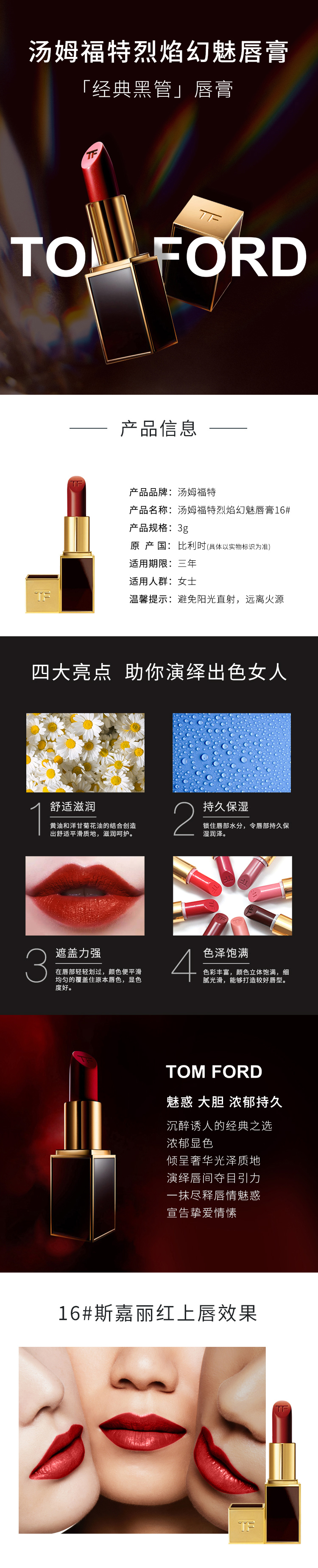 【经典色号】美国汤姆福特(TOM FORD)烈焰幻魅唇膏16#3g斯嘉丽红