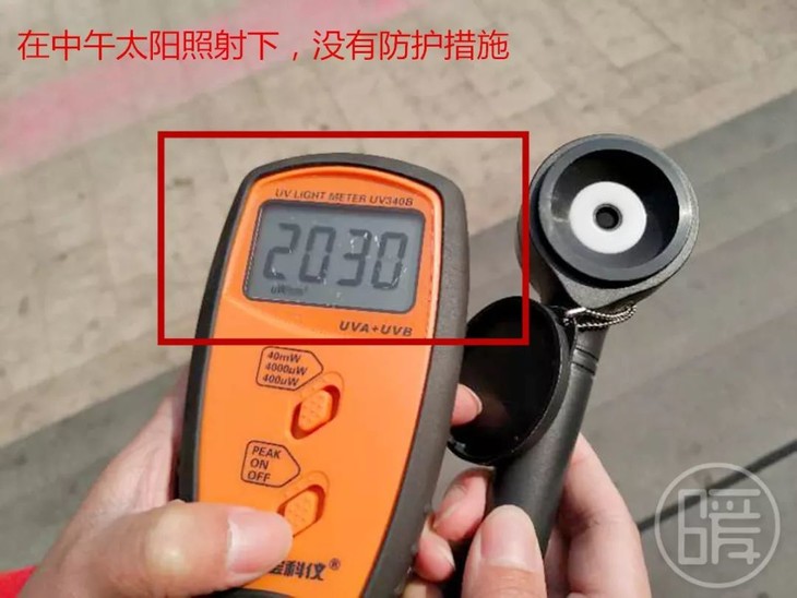 ▽在不做任何防晒措施时,仪器显示的紫外线强度为2030μW/cm²(微瓦/平方厘米),相当于4级曝晒指数。