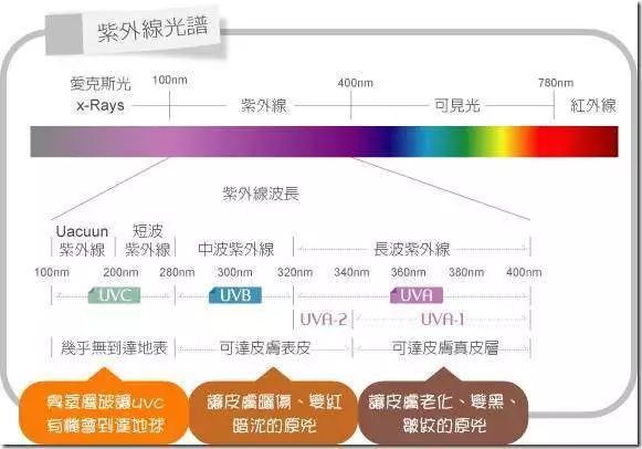 我们日常生活环境下,只有UVA和UVB,UVA让皮肤老化变黑(加粗划重点),UVB则是让皮肤晒伤。一般紫外线的测量单位为μW/cm²(微瓦/平方厘米)。曝晒级数分5级,超过3000μW/cm(4级线)就相当严重了。3级(1000-1500μW/cm范围内)既可以采取适当的防晒措施了。