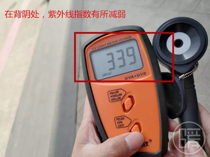 ▽在背阴处,仪器显示的紫外线强度达到了339μW/cm²(微瓦/平方厘米)。