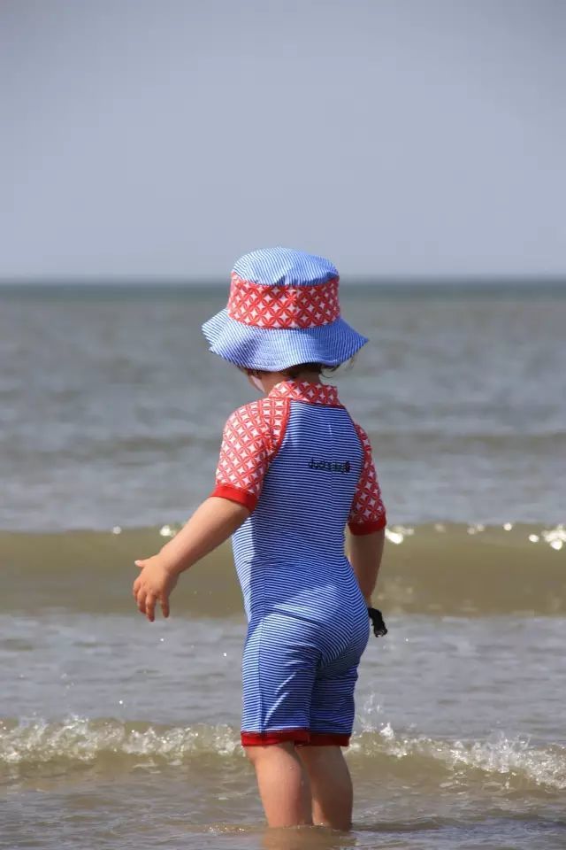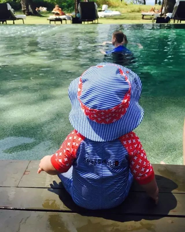 孩子做好防晒,我真的已经强调太多次了。美国儿科学会认为:6个月以上的宝宝,在夏季外出时必须戴太阳镜、遮阳帽,涂抹指数不低于SPF15的防晒霜。更何况沙滩和大海就像无数块强力反射镜,水边的紫外线比城市里的路面、草坪威猛好几倍,一定要给孩子穿上防护型的衣服。