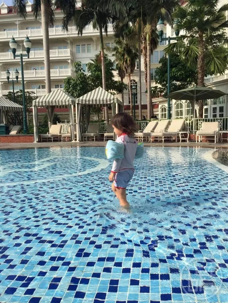 ▽2015年9月香港迪士尼酒店,爱玩水的小家伙又穿着泳衣下水了