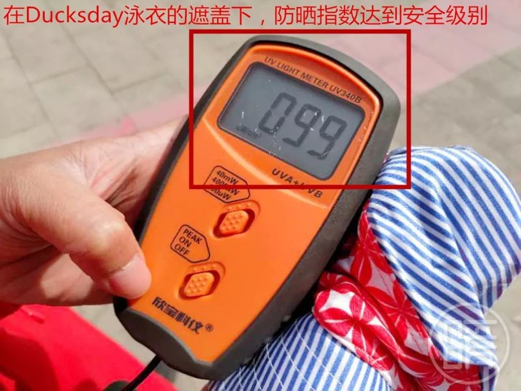 ▽在Ducksday泳衣覆盖下,仪器显示的紫外线强度达到了99μW/cm²(微瓦/平方厘米),相当于0-1级暴晒指数,达到了安全防晒的要求。