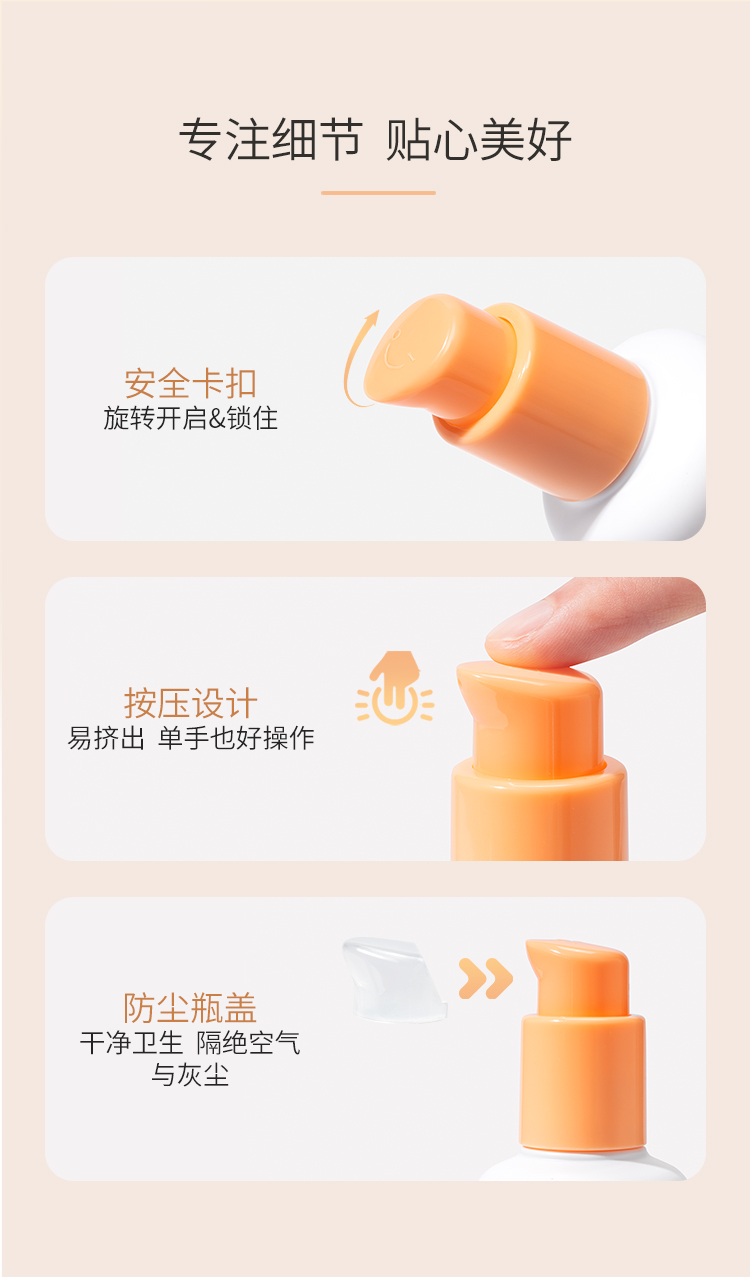 瓶盖有开关设计,往I方向轻拧一下,就可以打开摁出乳液,用完可以往方向拧一下关闭