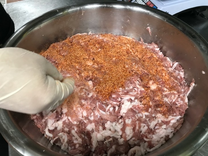 2.碎猪肉辣椒面、大蒜粉及海盐均匀搅拌