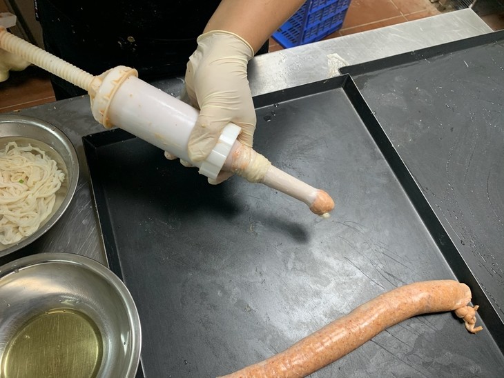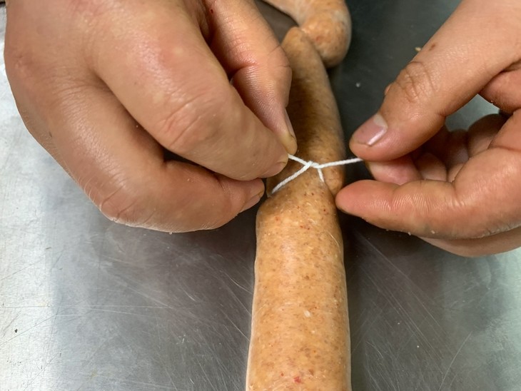 5. 完成灌肉后进行香肠的长宽尺寸测量,在指定长度上分段打结