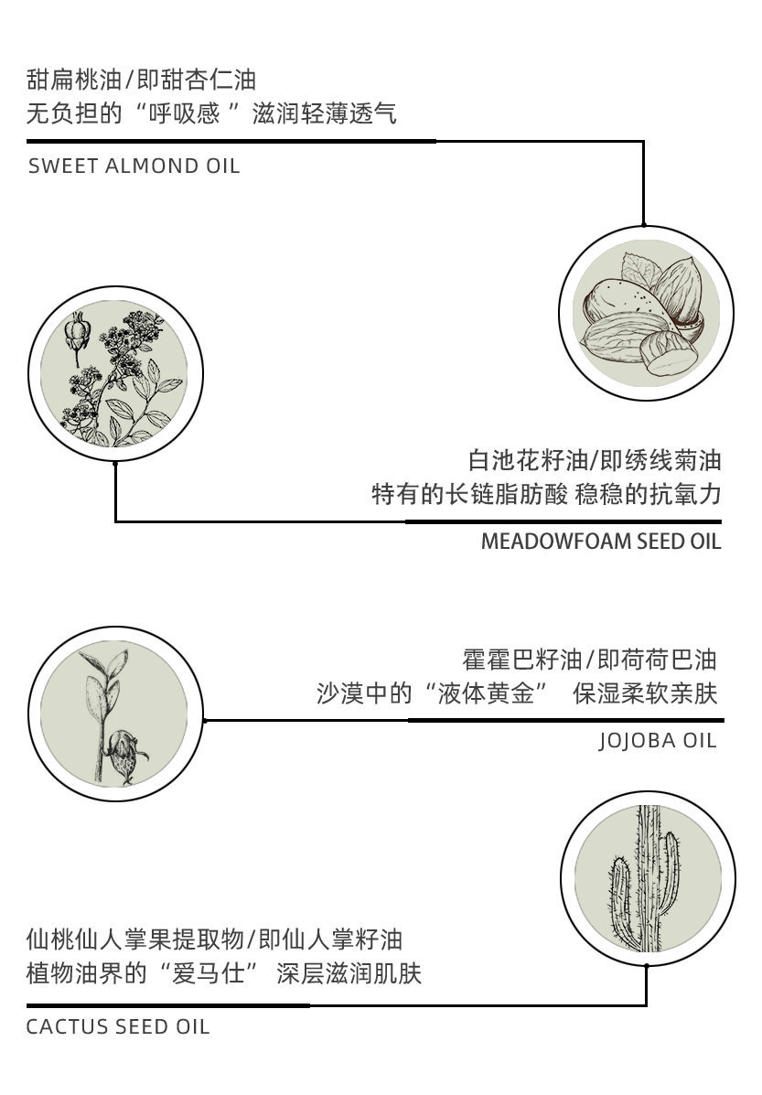 甜杏仁油、荷荷巴油的轻盈延展,海甘蓝籽油、仙人掌籽油的丰富包裹感,以及白池花籽油、油莎草根油的长效协同作用,帮助润感更持久。它们共同构成了一抹如丝缎般的亲肤油液。