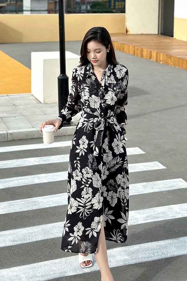 顺丰包邮洛诗琳20023春季新款皱缎提花绑带翻领连衣裙女1775