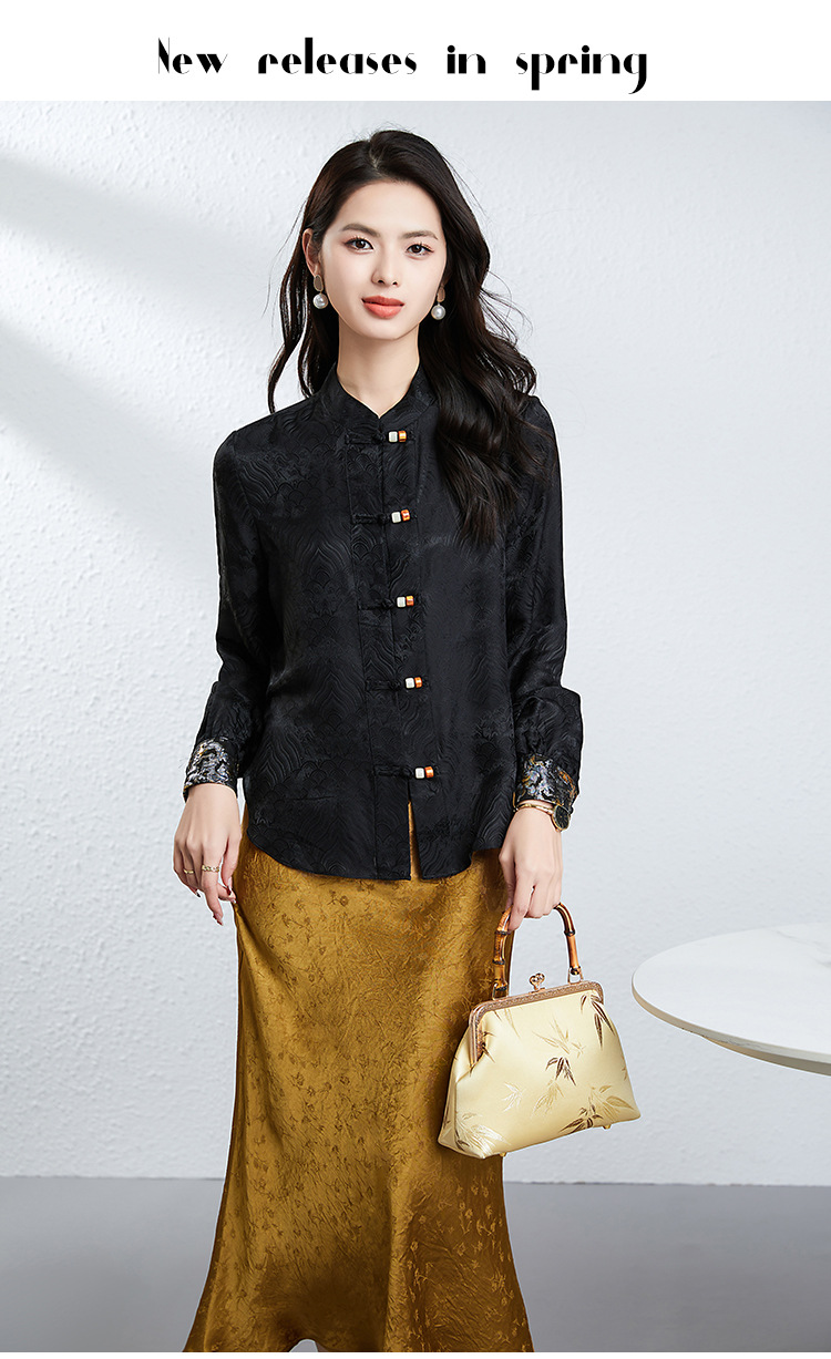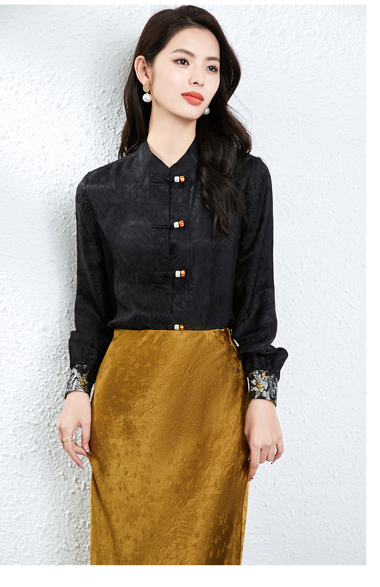 丁摩 国风衬衫女春季新款新中式衬衣收腰盘扣立领真丝桑蚕丝上衣5ZF-25012