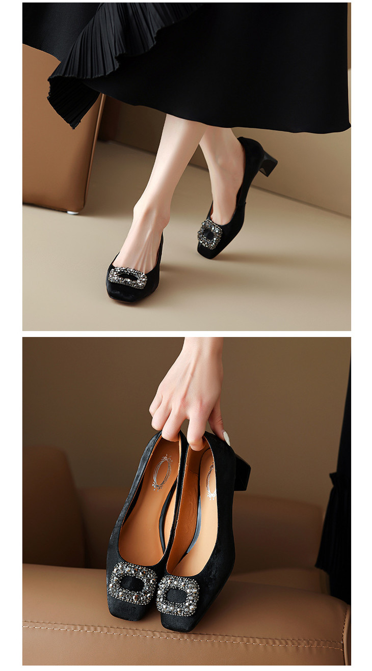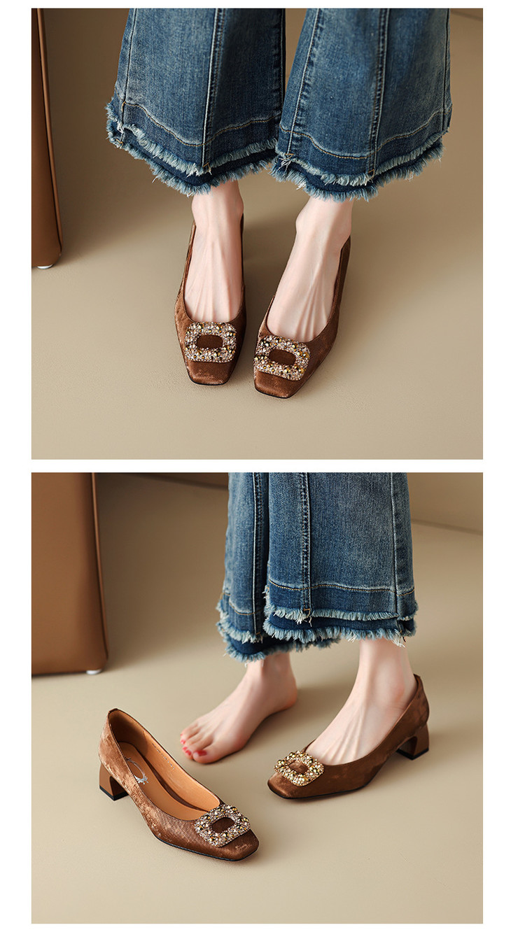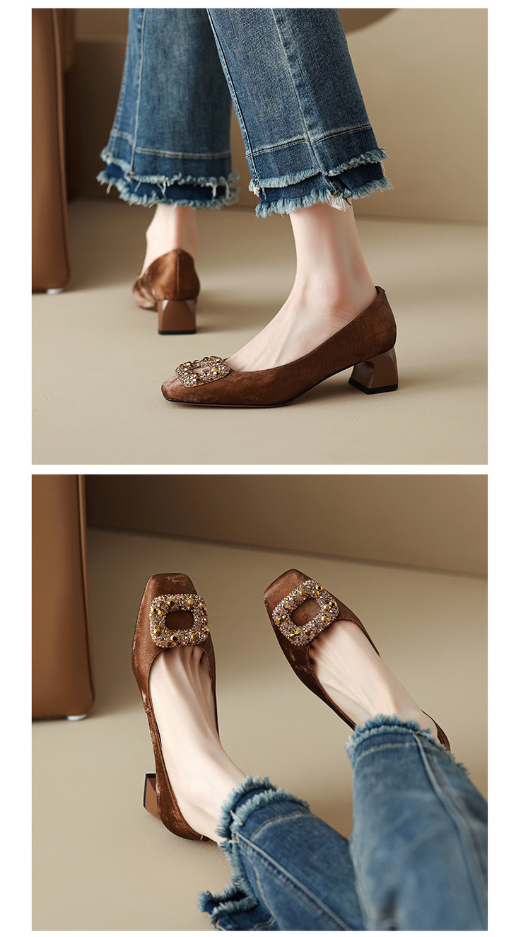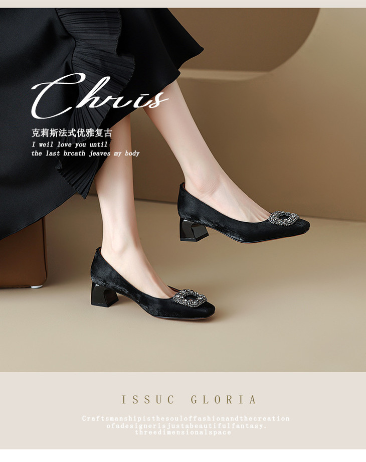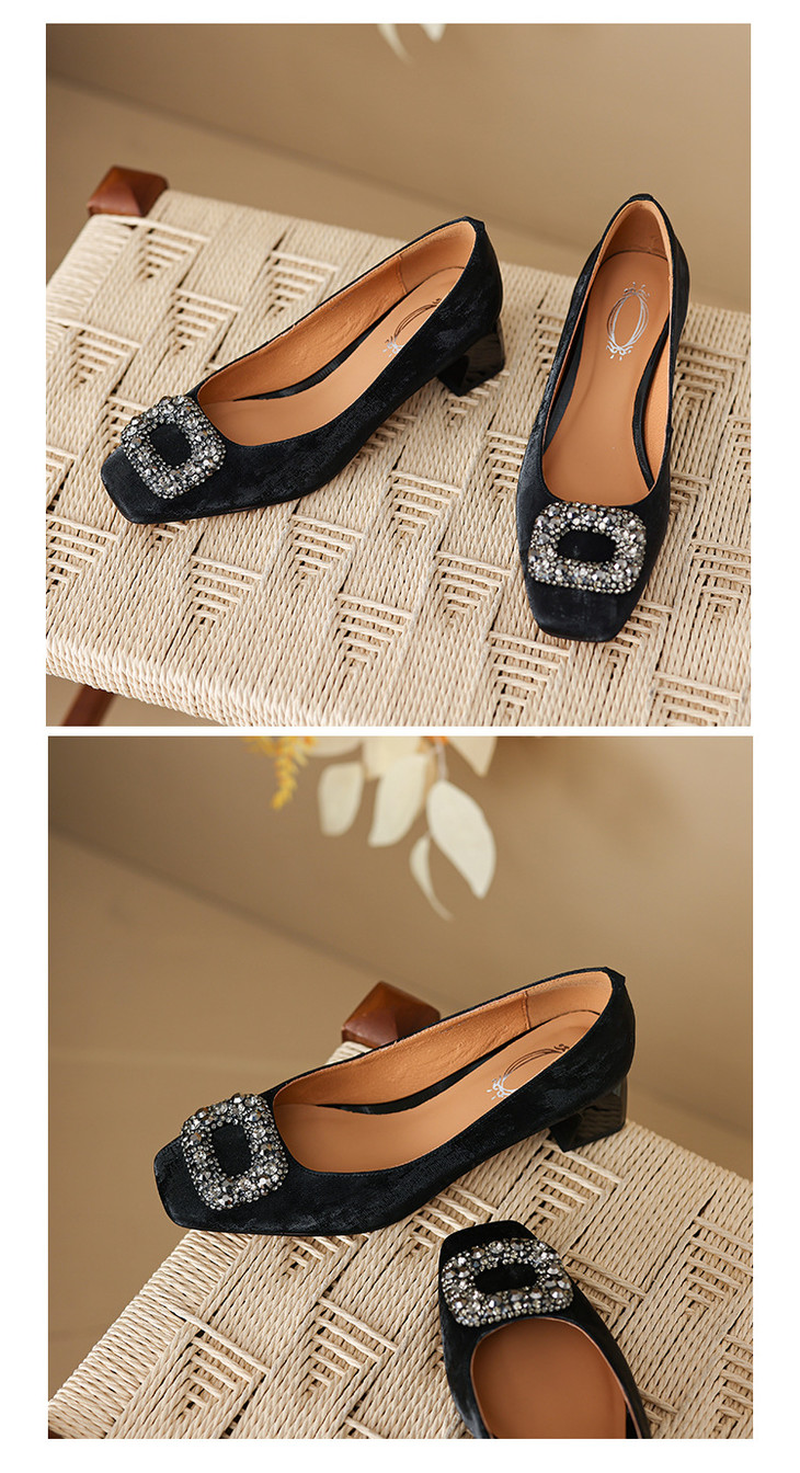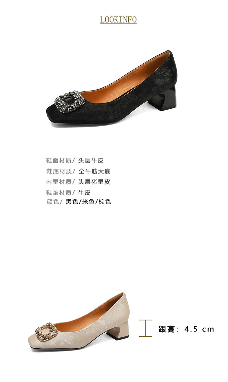 【预售5天】复古方头浅口单鞋女新款真皮百搭粗跟水钻方扣一脚蹬通勤低跟单鞋MS-7336