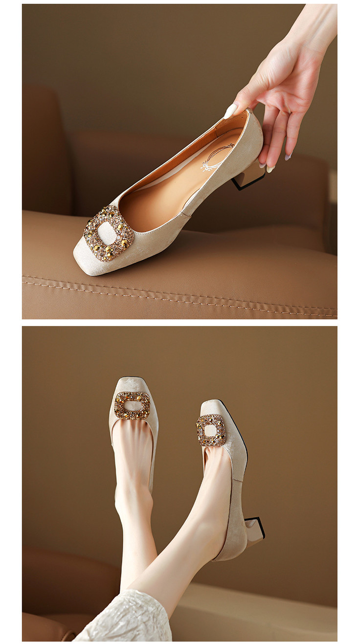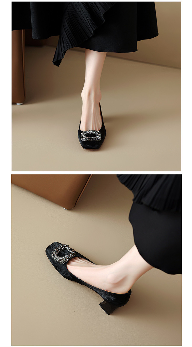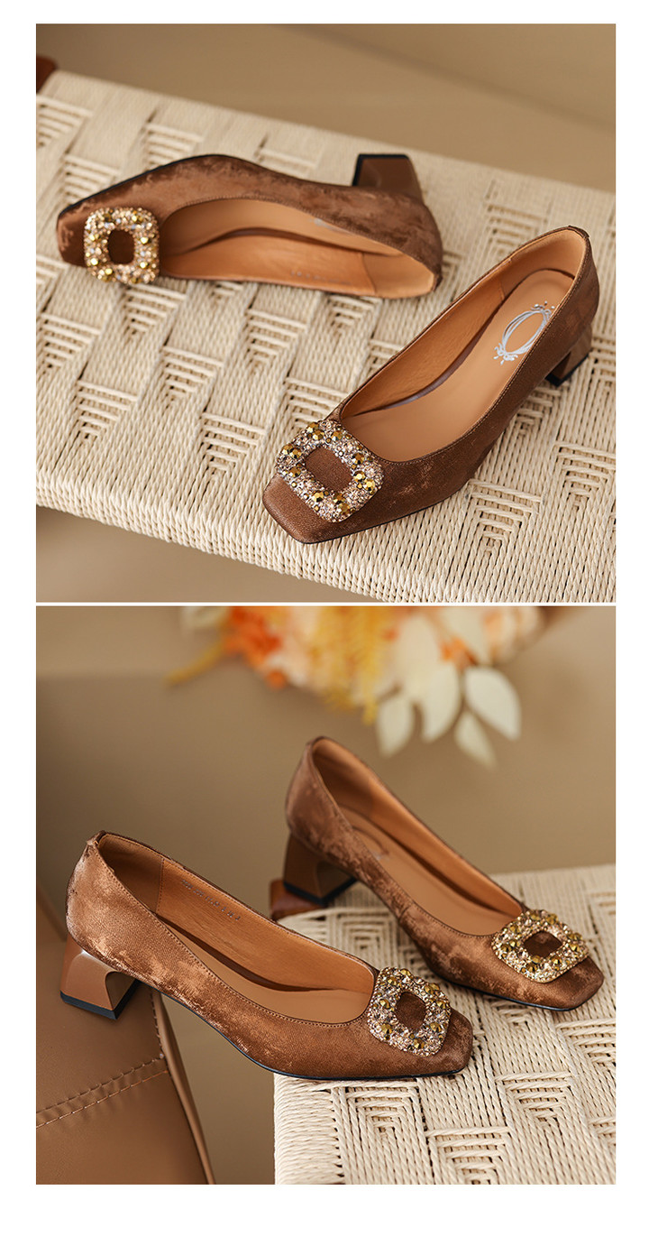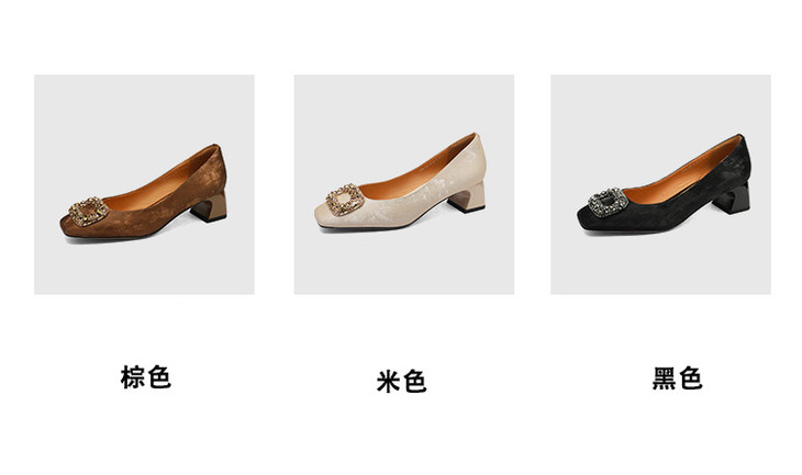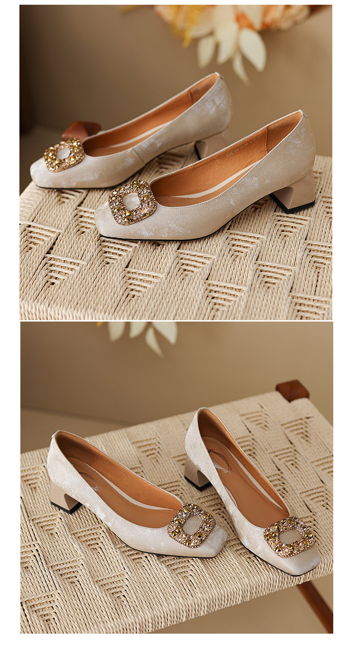 【预售5天】复古方头浅口单鞋女新款真皮百搭粗跟水钻方扣一脚蹬通勤低跟单鞋MS-7336
