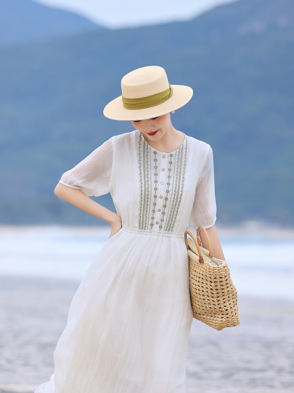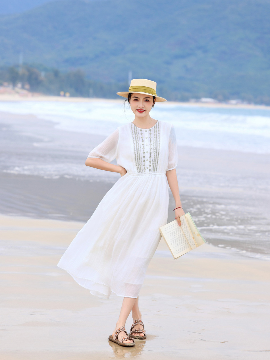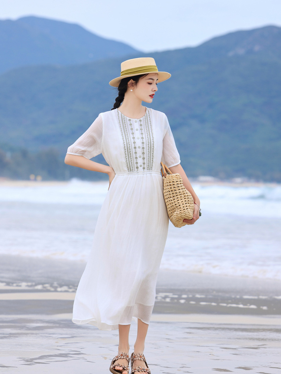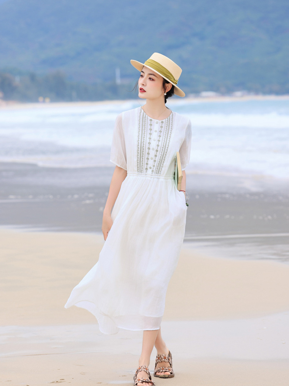 丁摩 白色飘逸细苎麻加捻刺绣短五分袖系带大码显瘦连衣裙HS25803