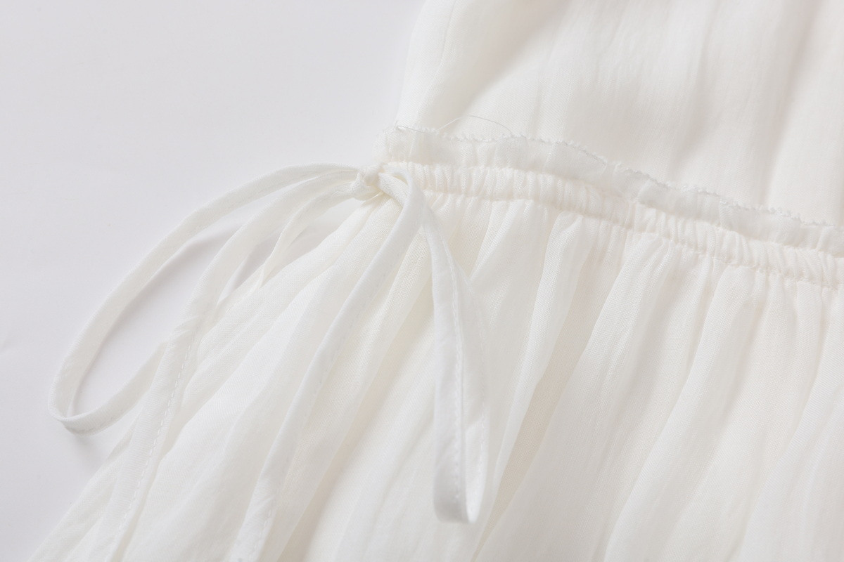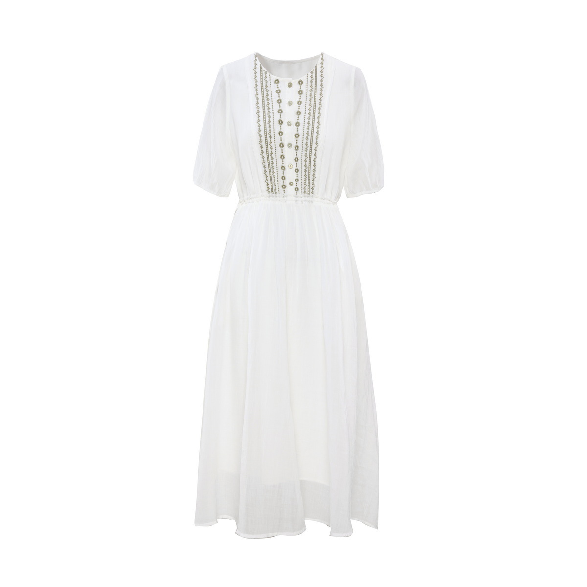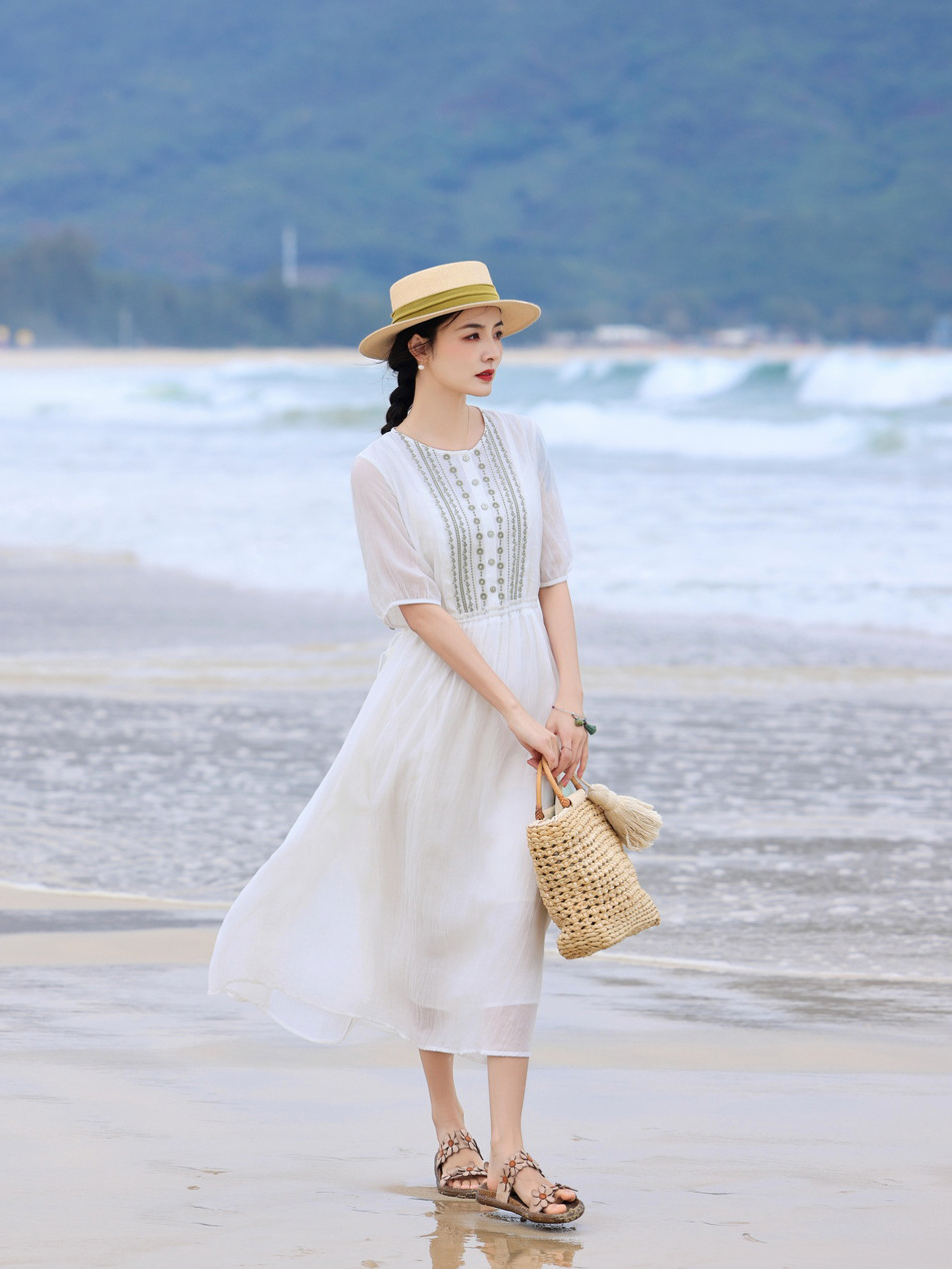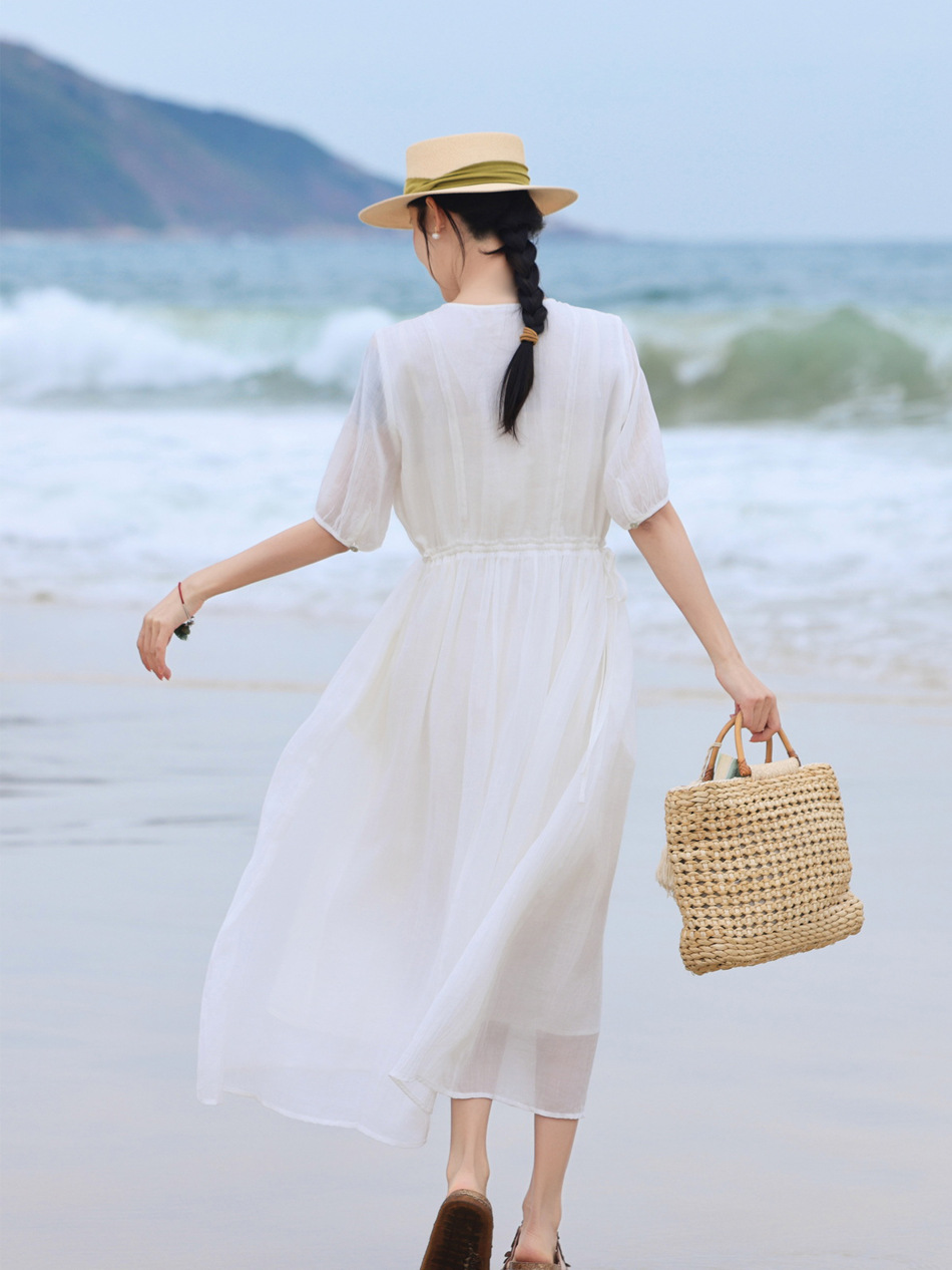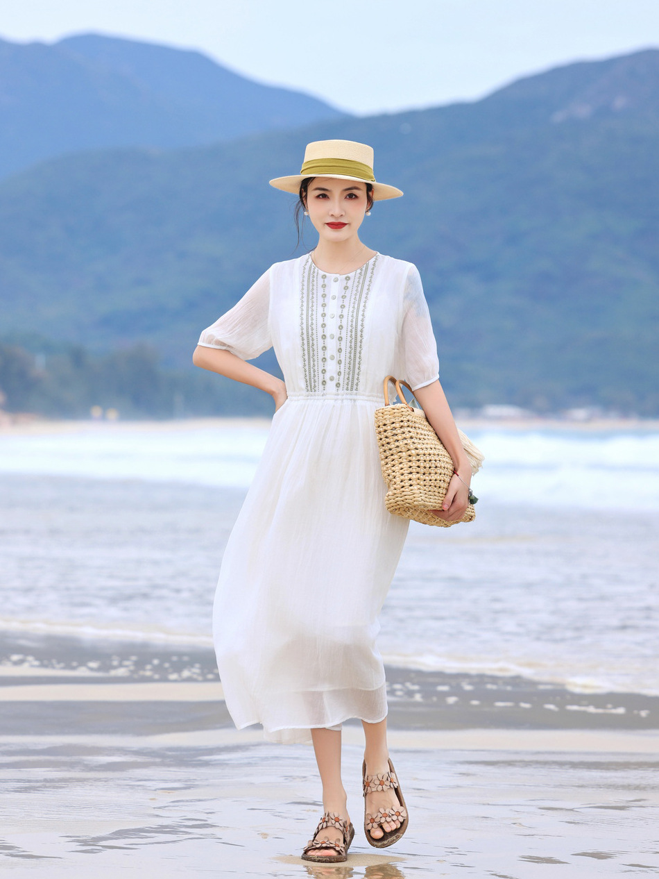 丁摩 白色飘逸细苎麻加捻刺绣短五分袖系带大码显瘦连衣裙HS25803
