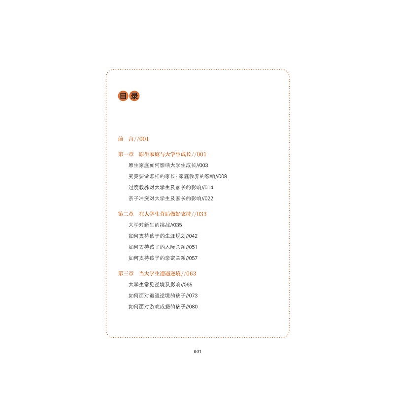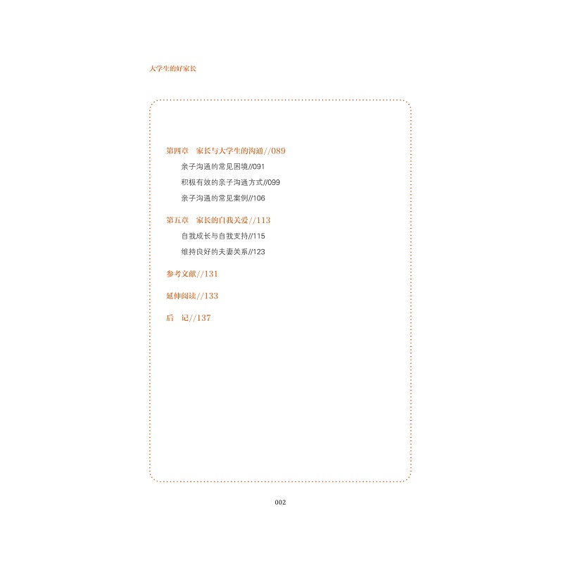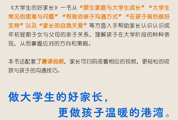 《大学生的好家长》一书从“原生家庭与大学生成长”“大学生常见的困难与问题”“有效的亲子沟通方式”“在孩子背后做好支持”以及“家长的自我关爱”等方面入手帮助家长认识认识成年初显期子女与父母的亲子关系,理解孩子在大学阶段的种种表现,从而掌握应对的方向和策略。本书还配套了慕课视频,家长可扫码观看相应的视频,更轻松的收获与孩子的沟通技巧。做大学生的好家长,更做孩子温暖的港湾。