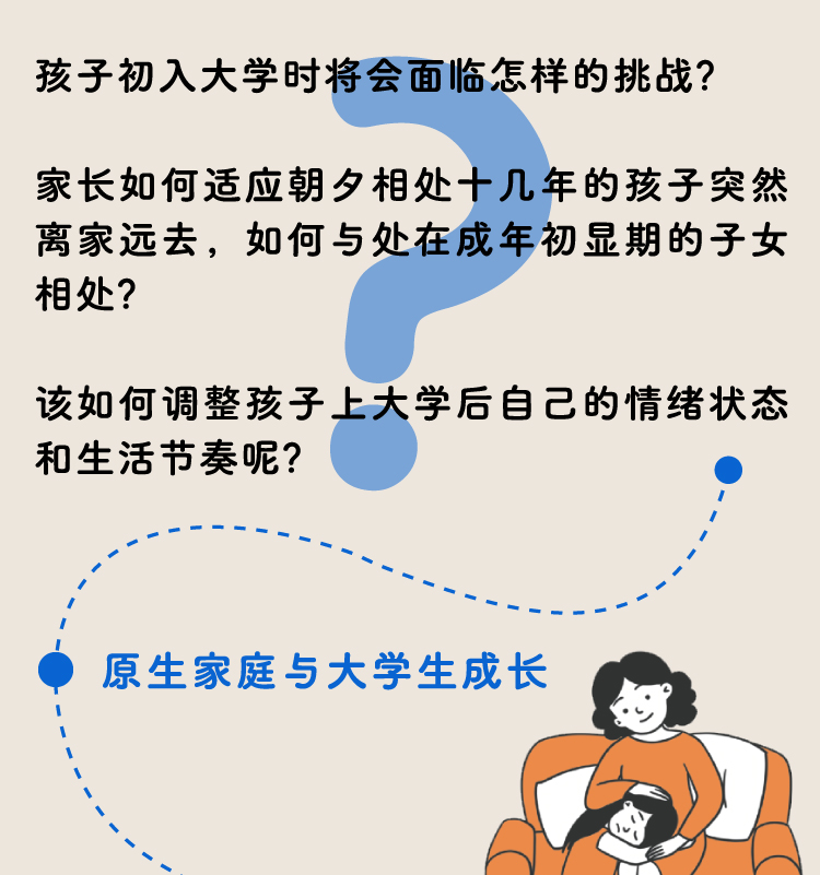 孩子初入大学时将会面临怎样的挑战?家长如何适应朝夕相处十几年的孩子突然离家远去,如何与处在成年初显期的子女相处?又该如何调整孩子上大学后自己的情绪状态和生活节奏呢?