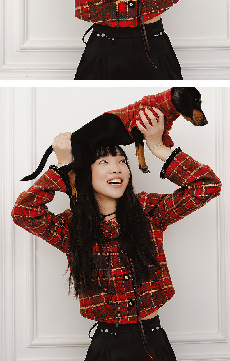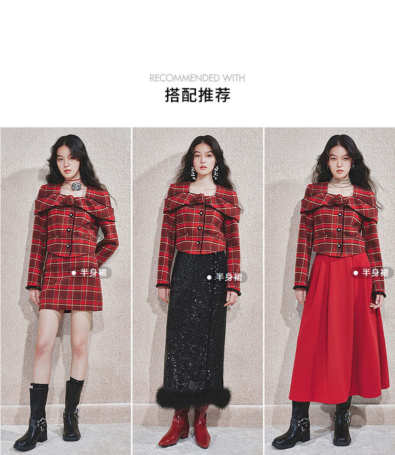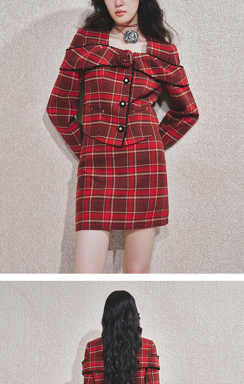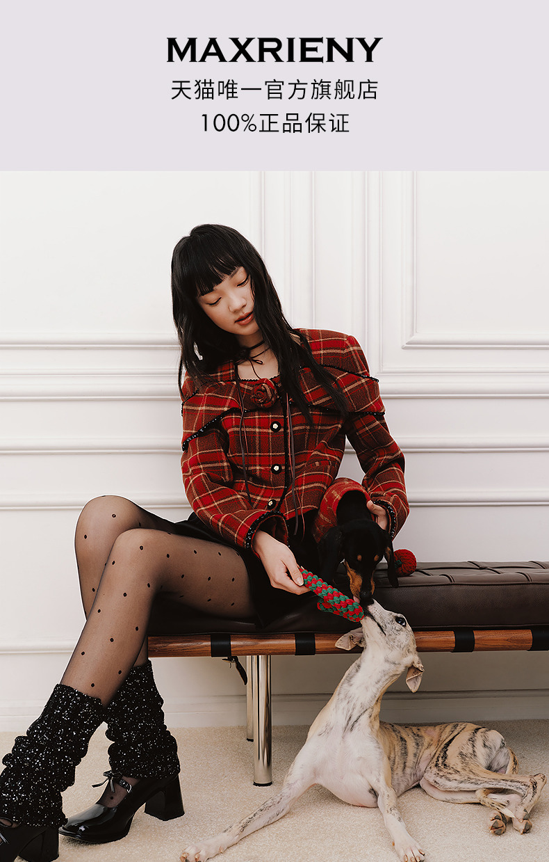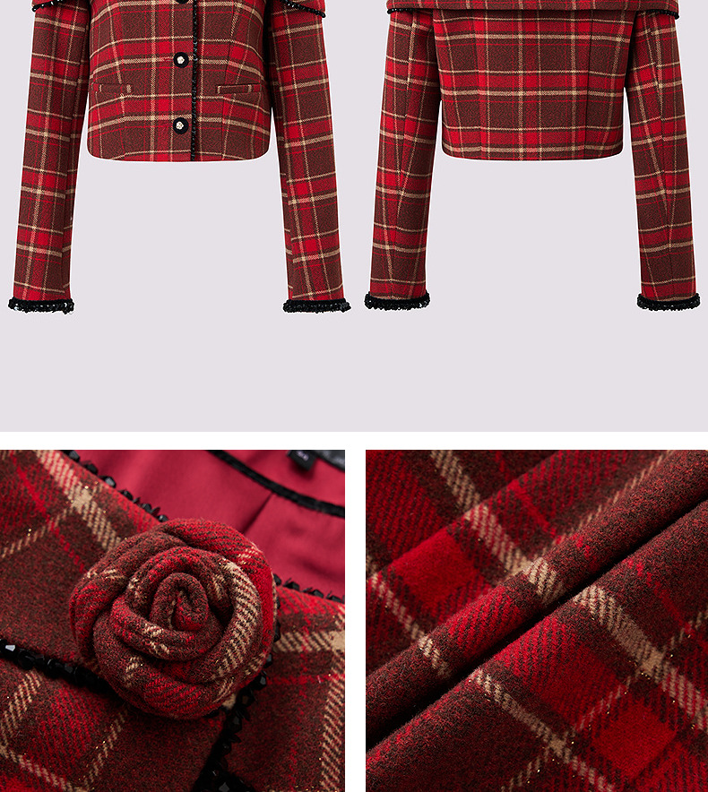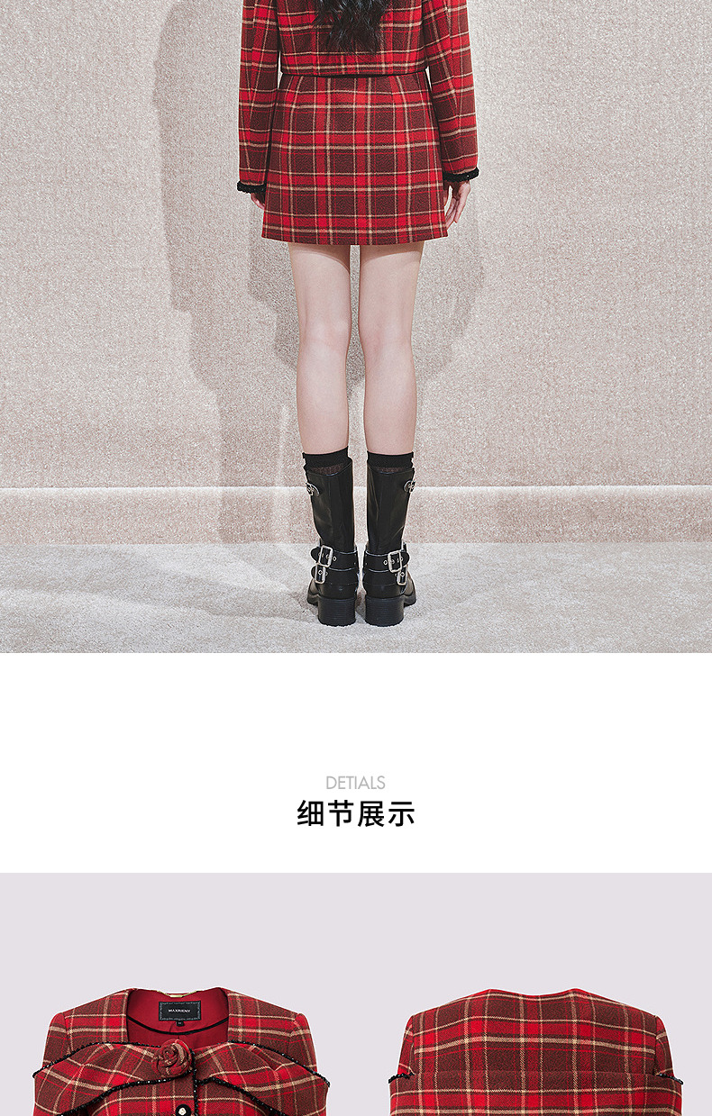 MAXRIENY【商场同款-节庆穿搭新年红】复古优雅感红格纹外套女(货号:MC85JA779)