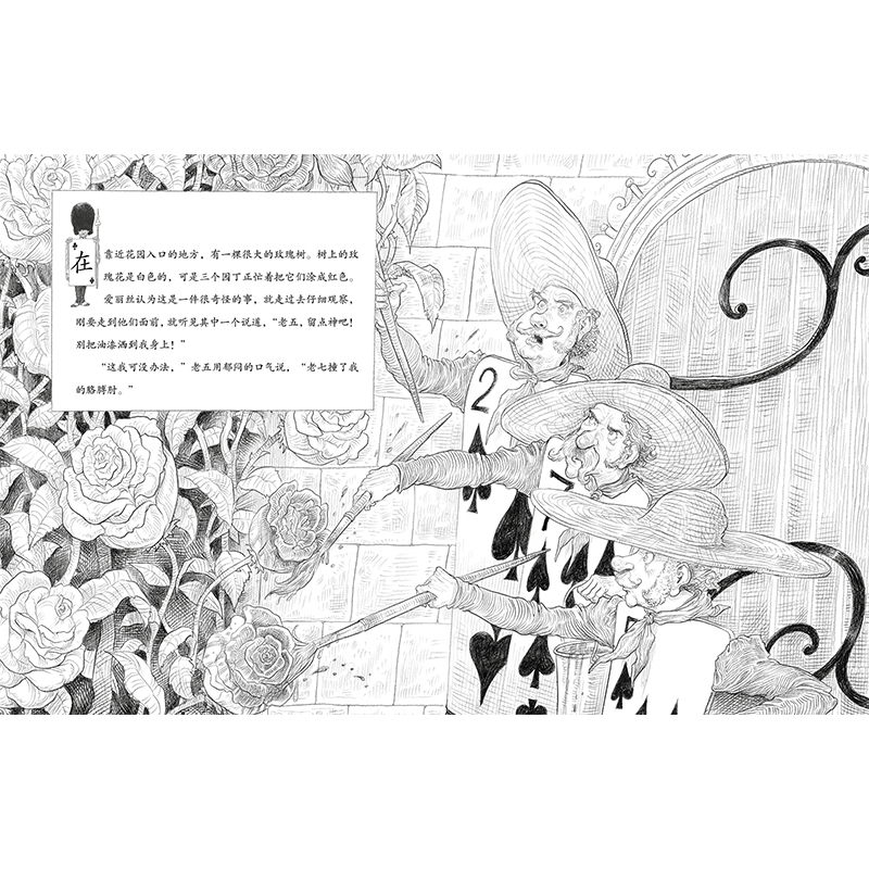★克里斯·里德尔的两部插图珍藏本,还有多处插画的创新:爱丽丝的衣着和发型,爱丽丝三姐妹的同时“出镜”,以及改变性别的疯帽匠。此外书中还有爱丽丝身高变化图、象棋红白双方角色图等,细节丰富有趣,创意十足。