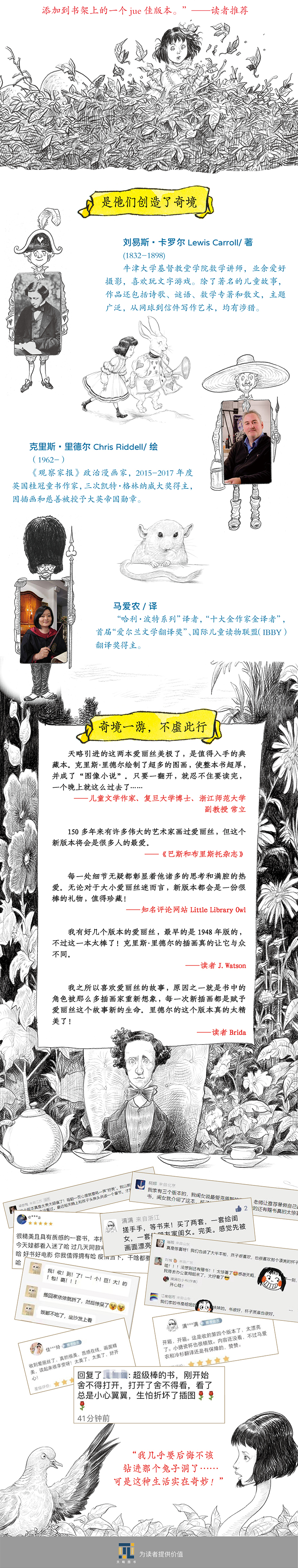 ★英国桂冠童书作家、三次凯特·格林纳威大奖得主克里斯·里德尔,新近创作450幅彩色和黑白插图,致敬经典。出生于1962年的克里斯·里德尔,小时候临摹着两部爱丽丝故事的首版插画家约翰·坦尼尔的画作,便立志做一名插画家。现在在他的这两部新插画版中,无论是线条灵动、阴影交错的黑白插画,还是色彩瑰丽、笔触细腻的全彩插图,都充满着克里斯·里德尔独一无二的风格,也是向约翰·坦尼尔致敬。
