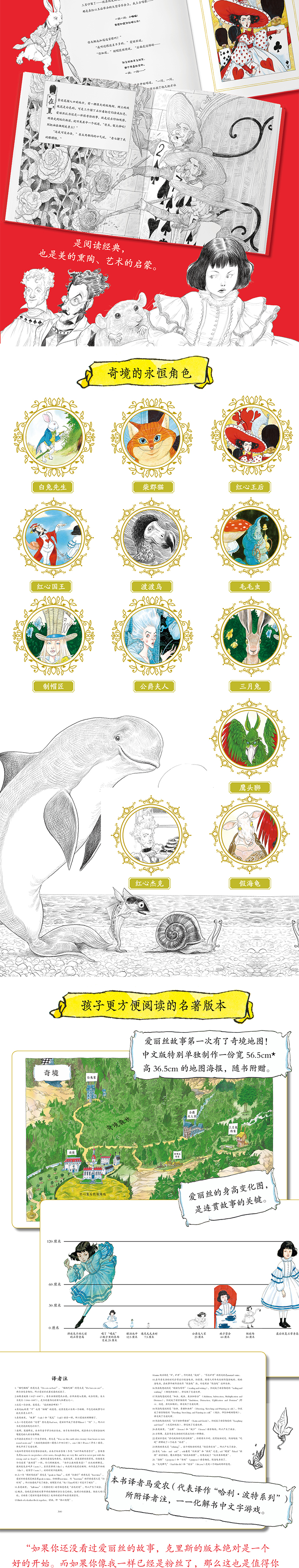 ★前附奇境地图、镜中之地地图,后附近百条注释,帮助孩子阅读名著。自出版150多年来,首次有插画家创作出故事发生地的地图,中文版随书赠送等比例放大的地图海报,方便读者从视觉上更直观地感受和理解故事。书中还有多处文字游戏、双关语、谜语等,所以书后近百条的详尽注释,能够帮助读者顺畅阅读。
