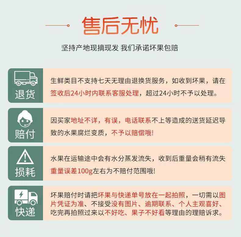 特别说明:由于生鲜水果市场价格波动较大,价保时间为:付款成功之后72小时之内联系客服有效,以付款成功的时间为准。