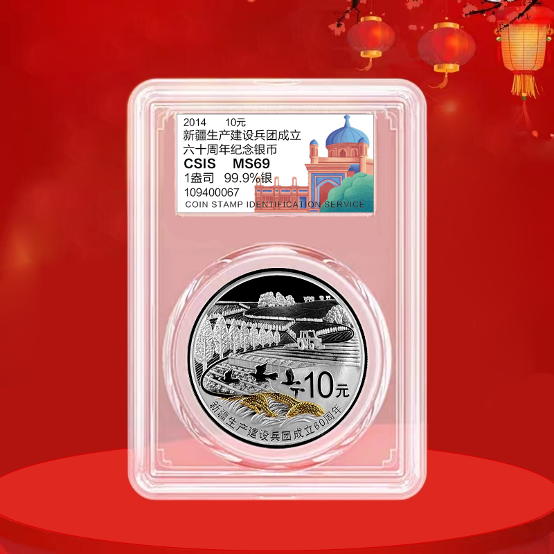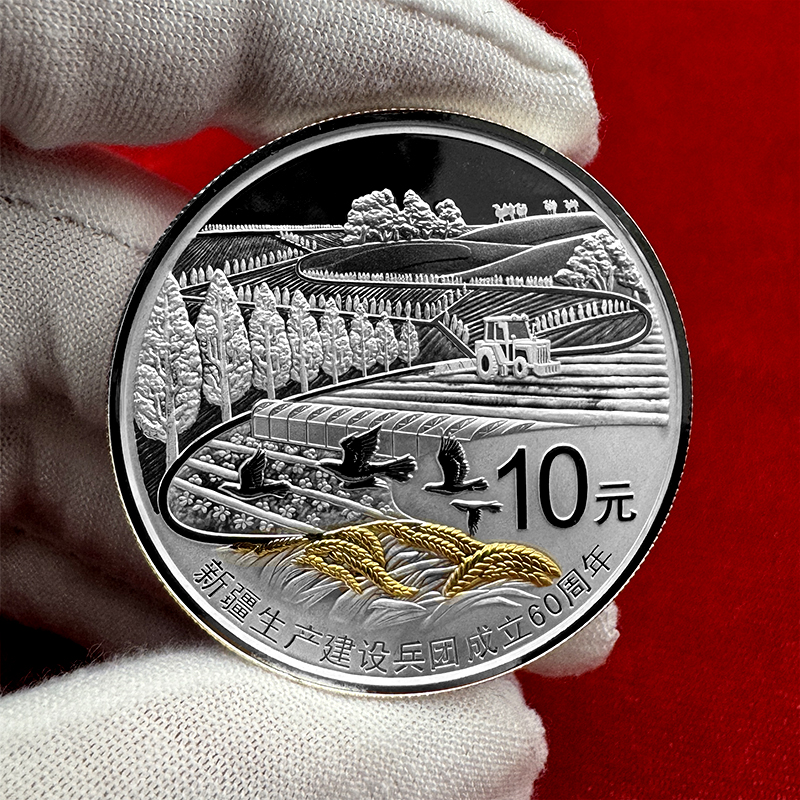 新疆生产建设兵团成立60周年1盎司银币 封装评级带证书 带礼盒