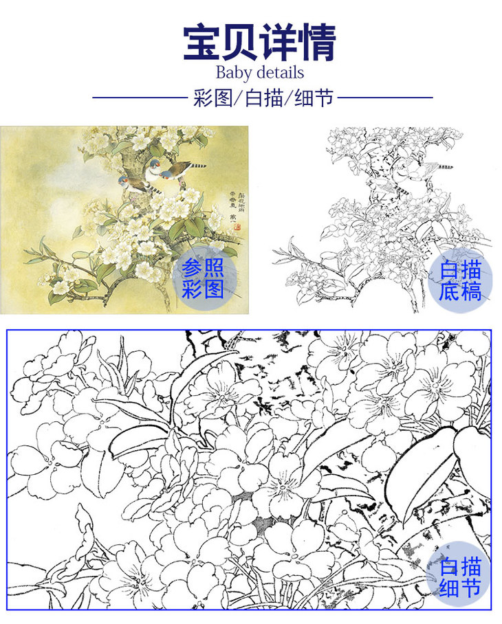 万一工笔花鸟白描底稿-梨花-斗方小品册页-WT04