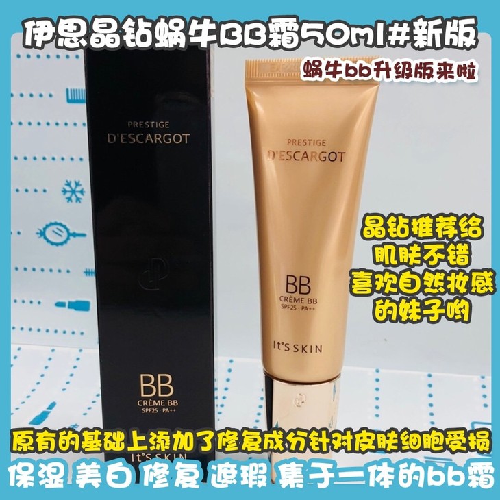 伊思晶钻蜗牛BB霜50ml#新版👍蜗牛bb升级版来啦⬆~在原有的基础上添加了👉修复成分针对皮肤细胞受损💆、皮肤老化有很好的改善再生效果👏。难得一款保湿☑、美白☑、修复☑、遮瑕☑集于一体的超赞bb霜,遮瑕修颜的同时,能改善皮肤😊,还能滋养肌肤呢💦!⚠注意啦⚠新包装是21号亮白色哦✨,与旧版本的色号相比有些不同哦,整体会白皙一个色号❗晶钻推荐给肌肤底子不错,喜欢自然妆感的妹子哟👯