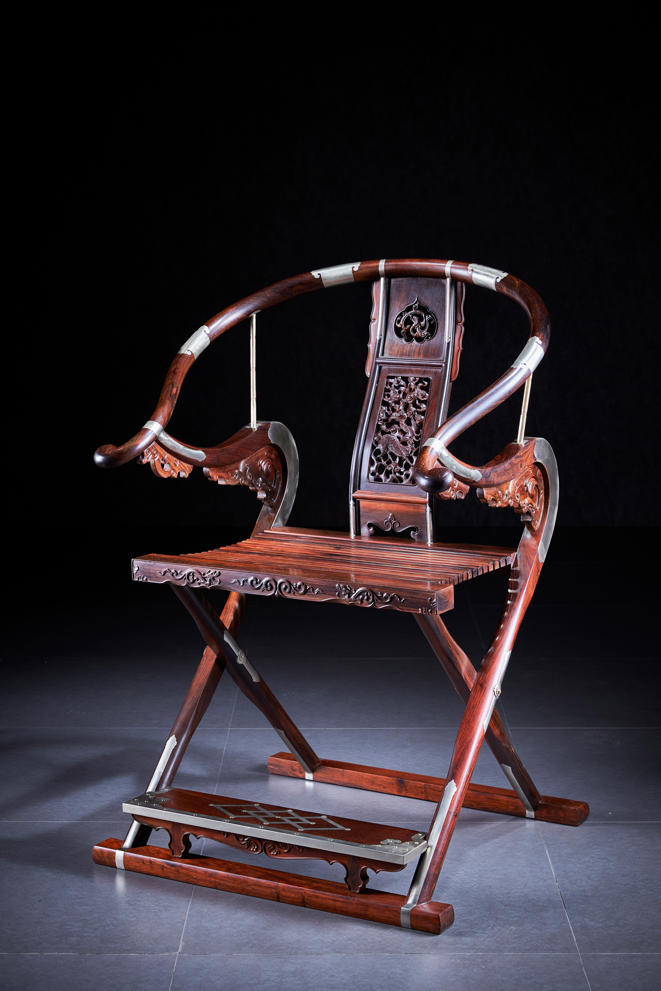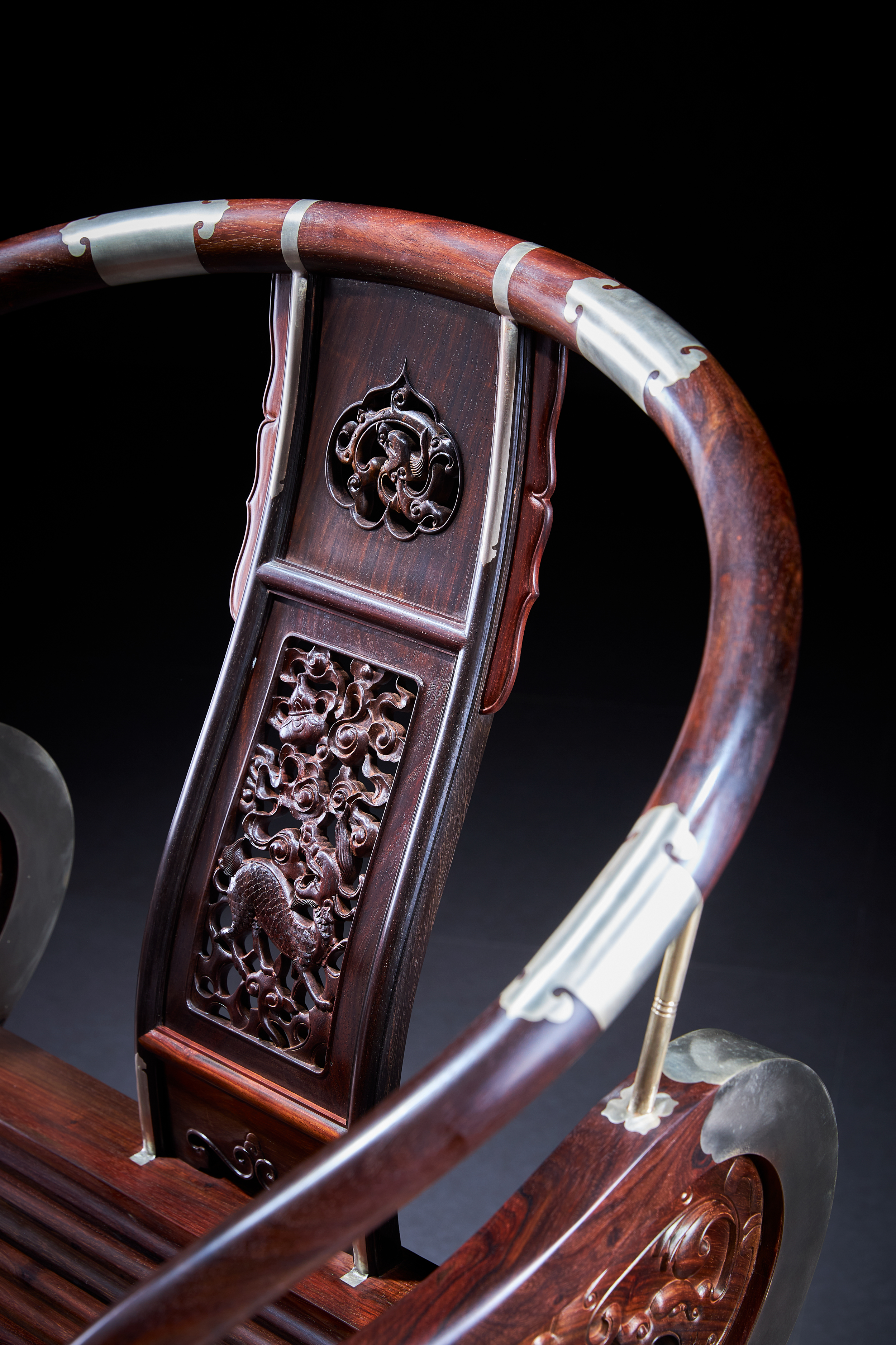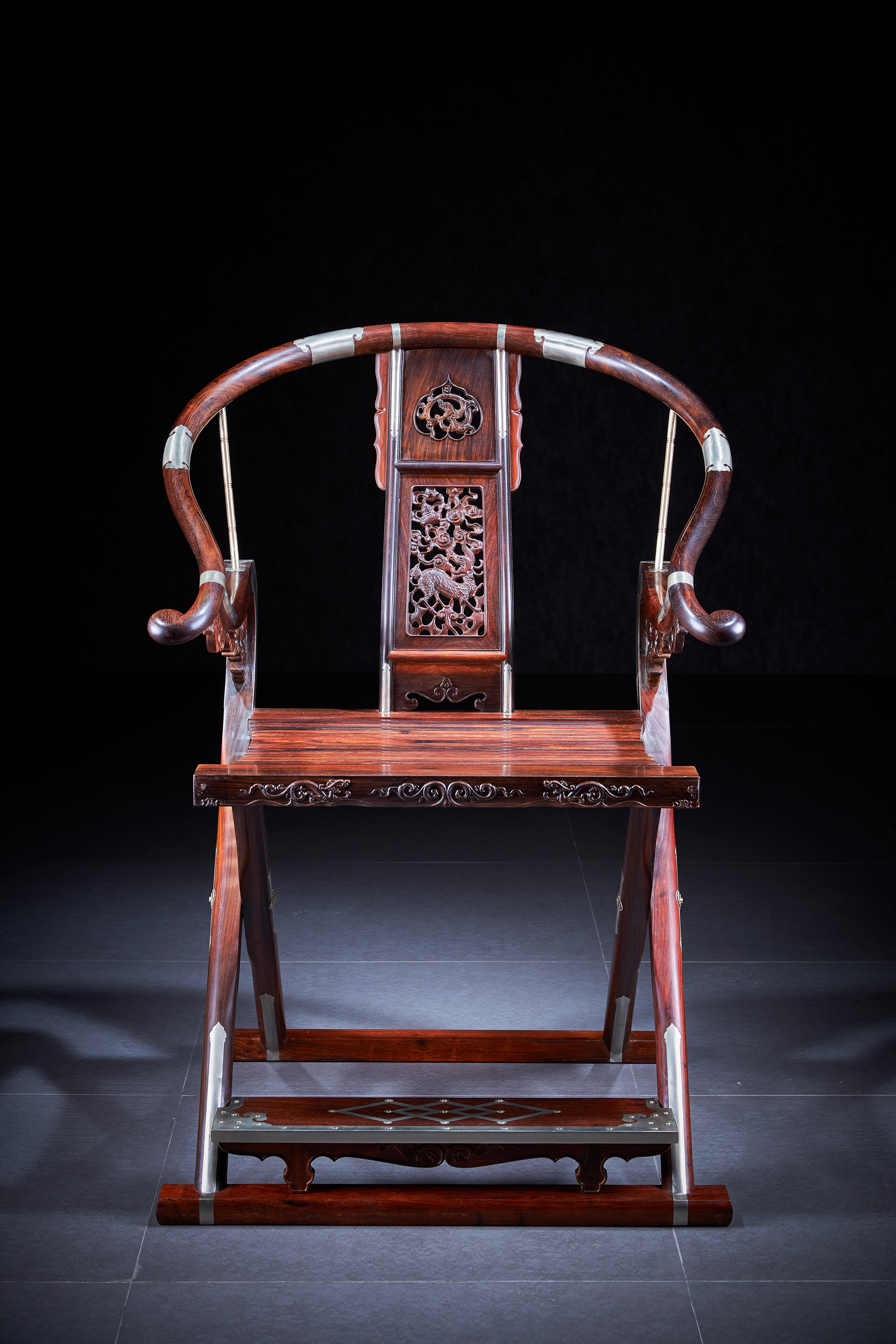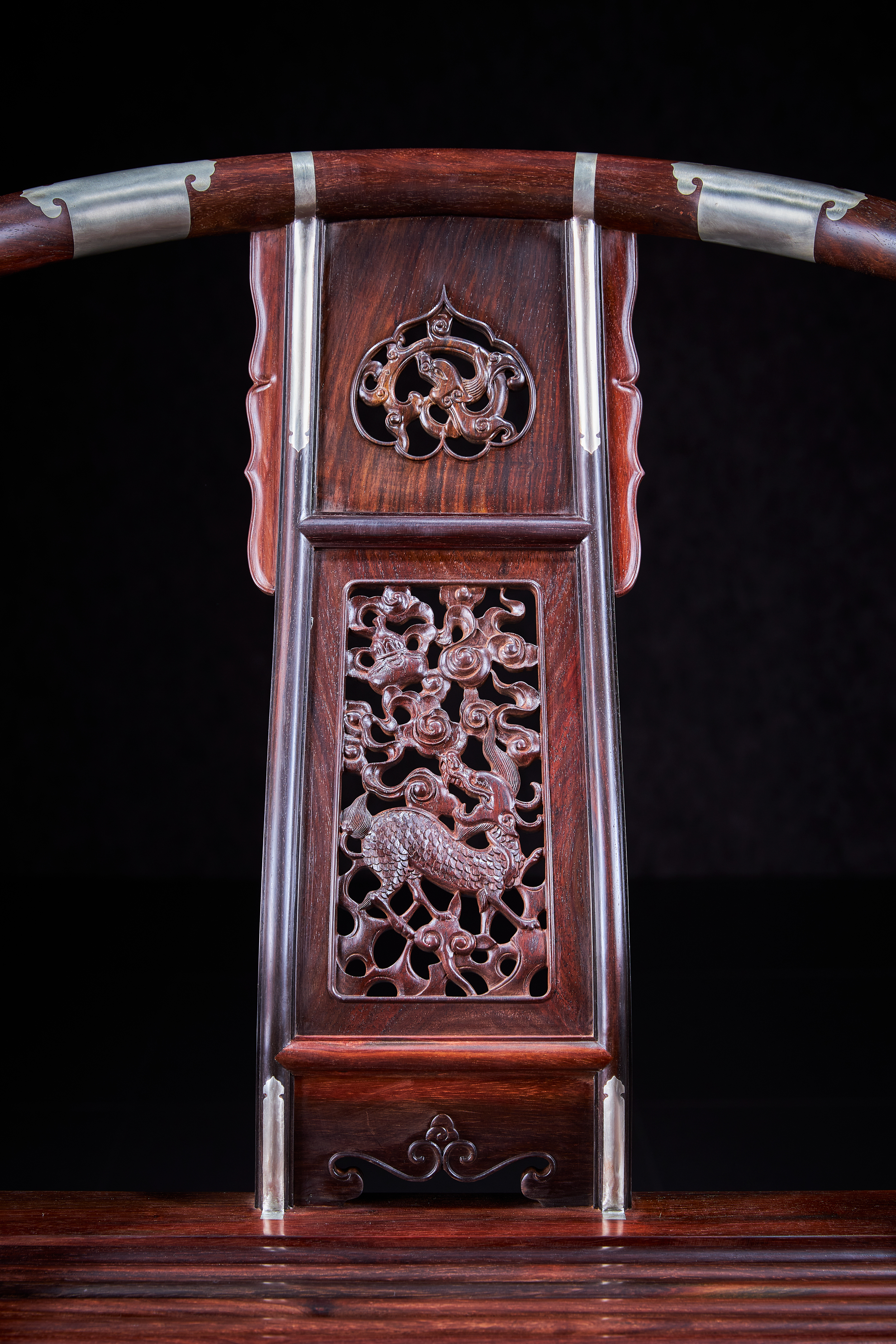 这把原型为王世襄旧藏黄花梨圆后背交椅,为众多行业人士,学习、复刻、研究的标准器。三截攒框镶板靠背,上部如意开光透雕螭龙纹,中部透雕麒麟、葫芦、山石、灵芝,下部亮脚起卷草纹阳线;嵌铜使其坚固,至精者,加微改良,施平嵌,工艺更为复杂。整体更为平顺,交椅在古时更为权势象征,今人多做主椅,赠长辈、领导,置空间显位营造氛围。