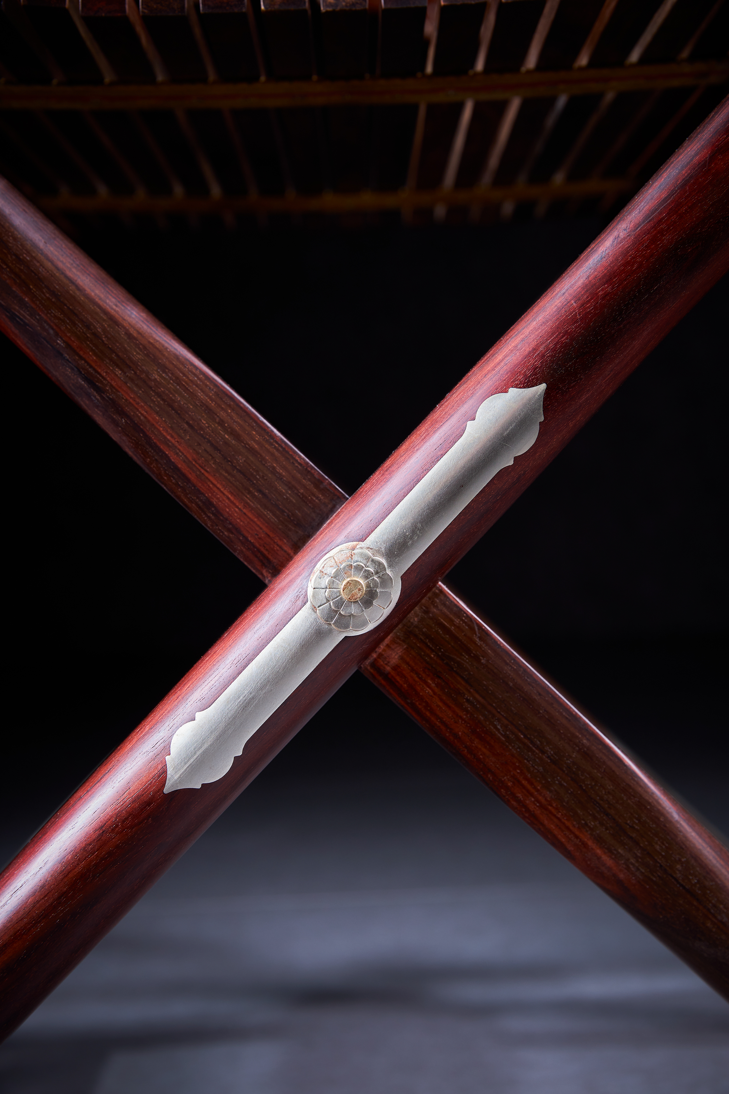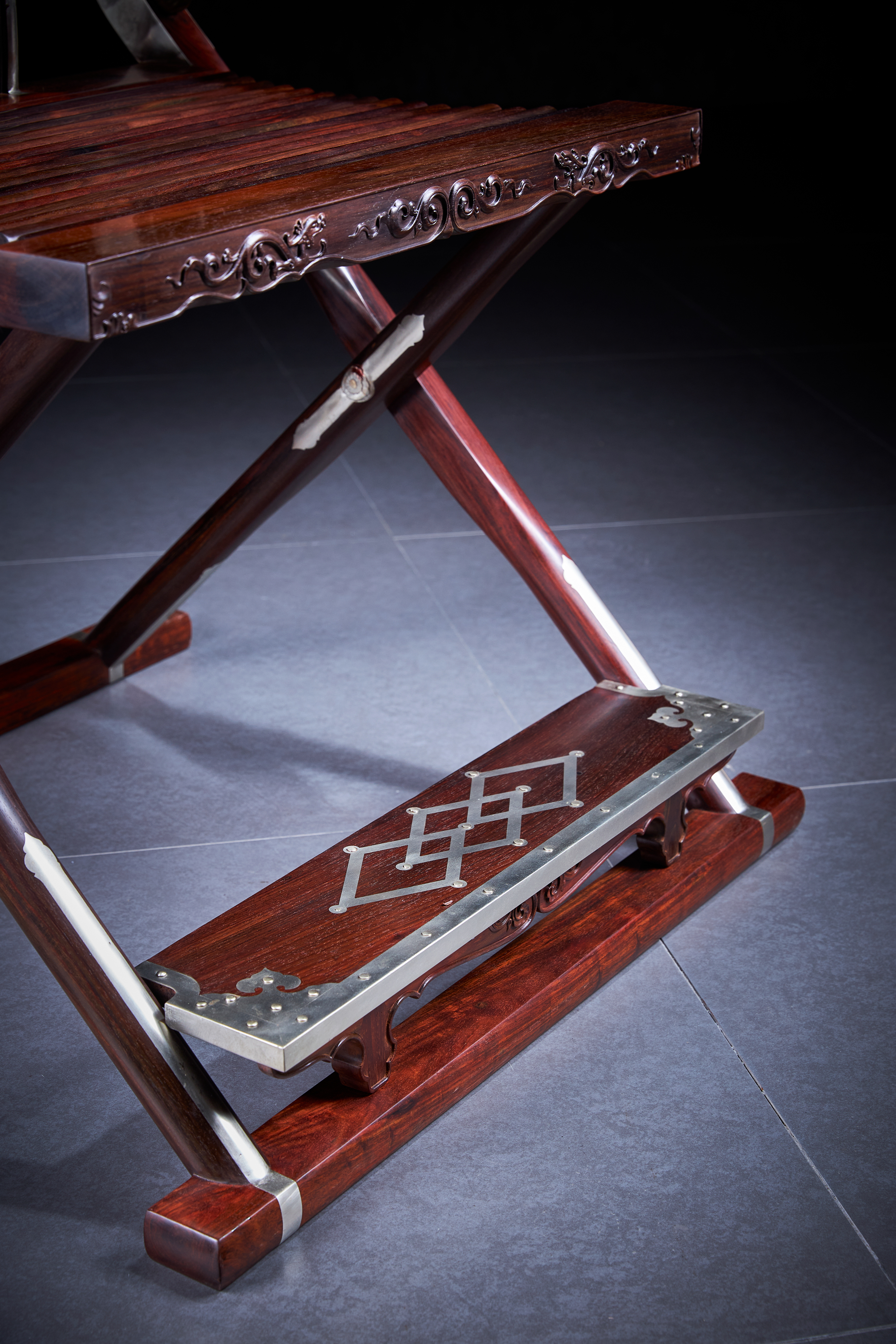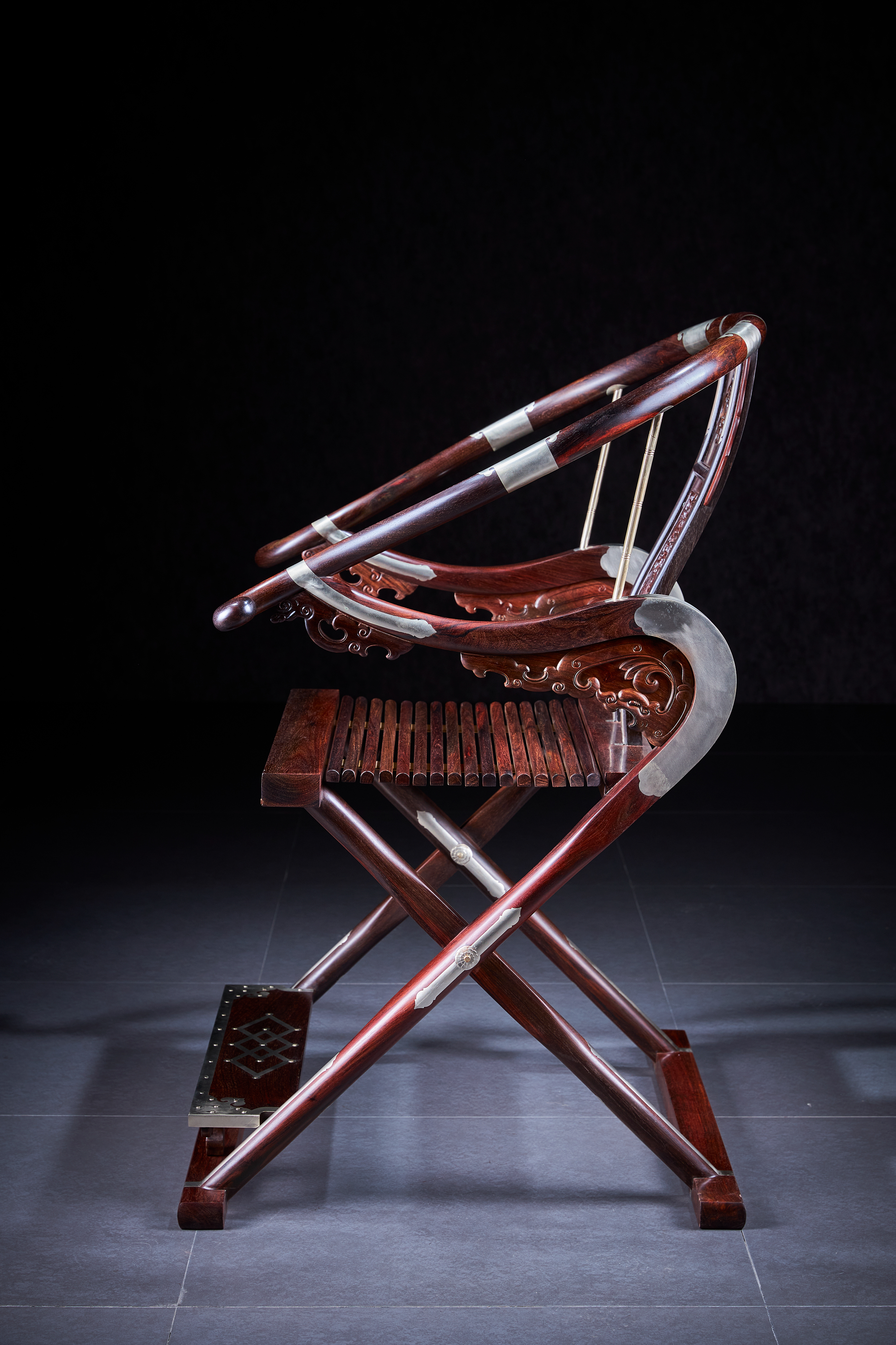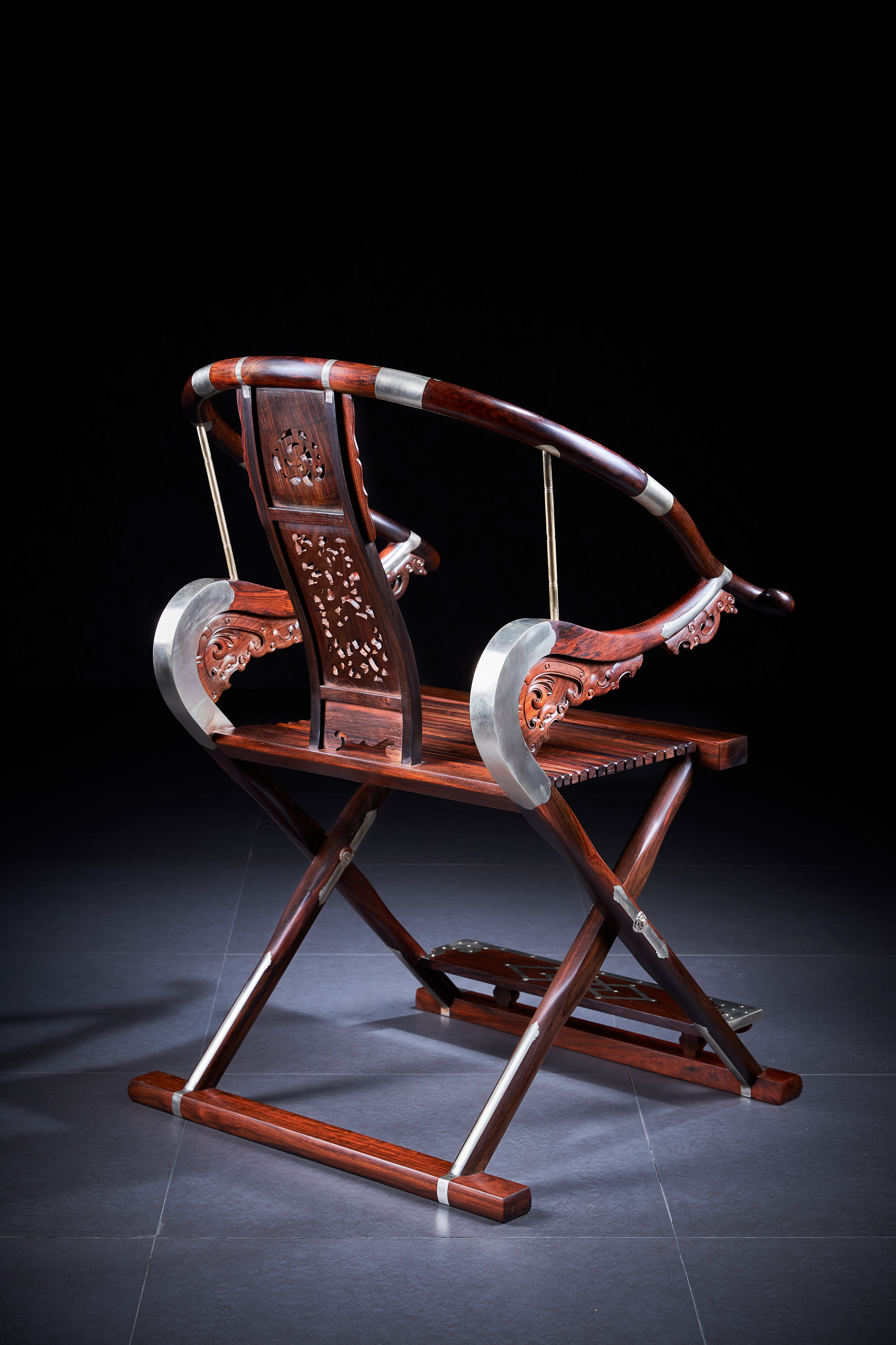 这把原型为王世襄旧藏黄花梨圆后背交椅,为众多行业人士,学习、复刻、研究的标准器。三截攒框镶板靠背,上部如意开光透雕螭龙纹,中部透雕麒麟、葫芦、山石、灵芝,下部亮脚起卷草纹阳线;嵌铜使其坚固,至精者,加微改良,施平嵌,工艺更为复杂。整体更为平顺,交椅在古时更为权势象征,今人多做主椅,赠长辈、领导,置空间显位营造氛围。