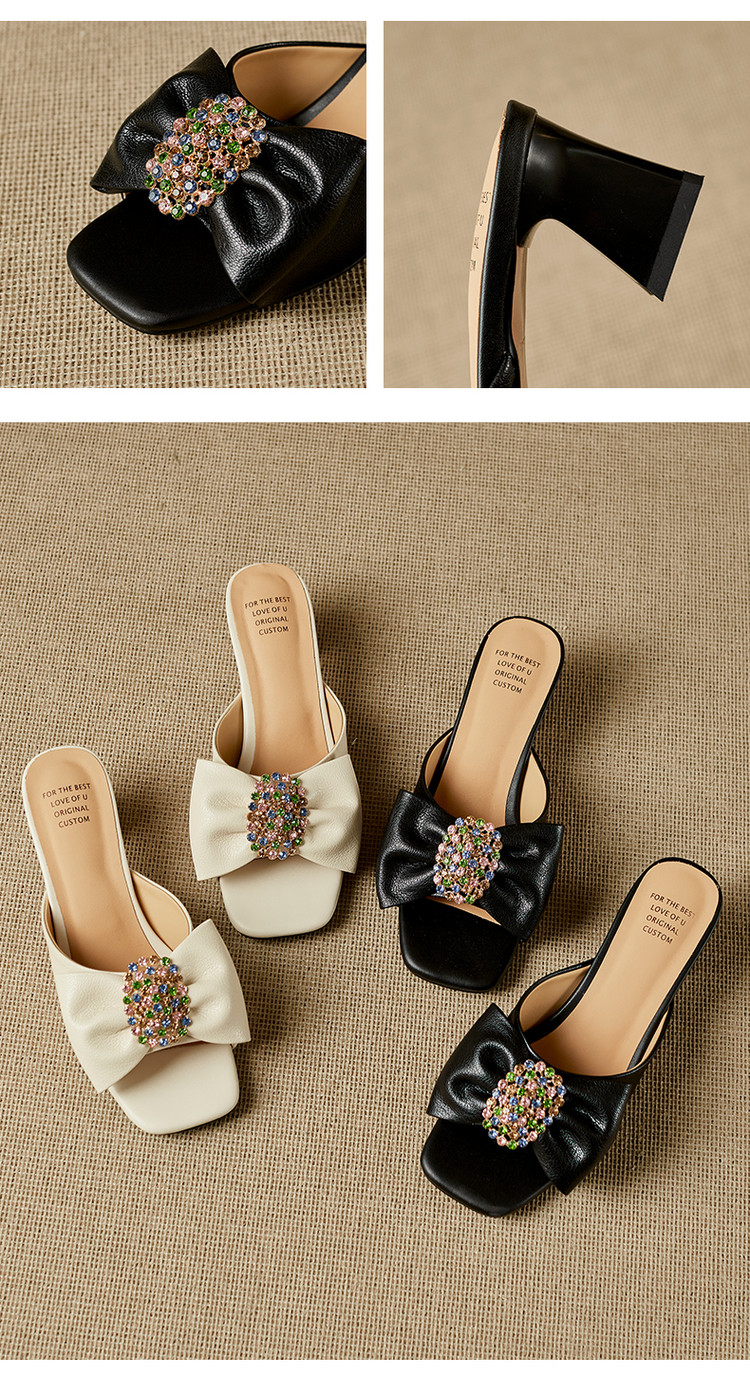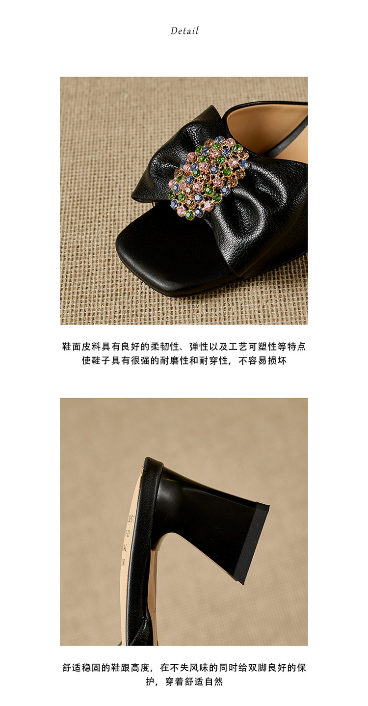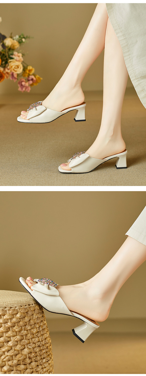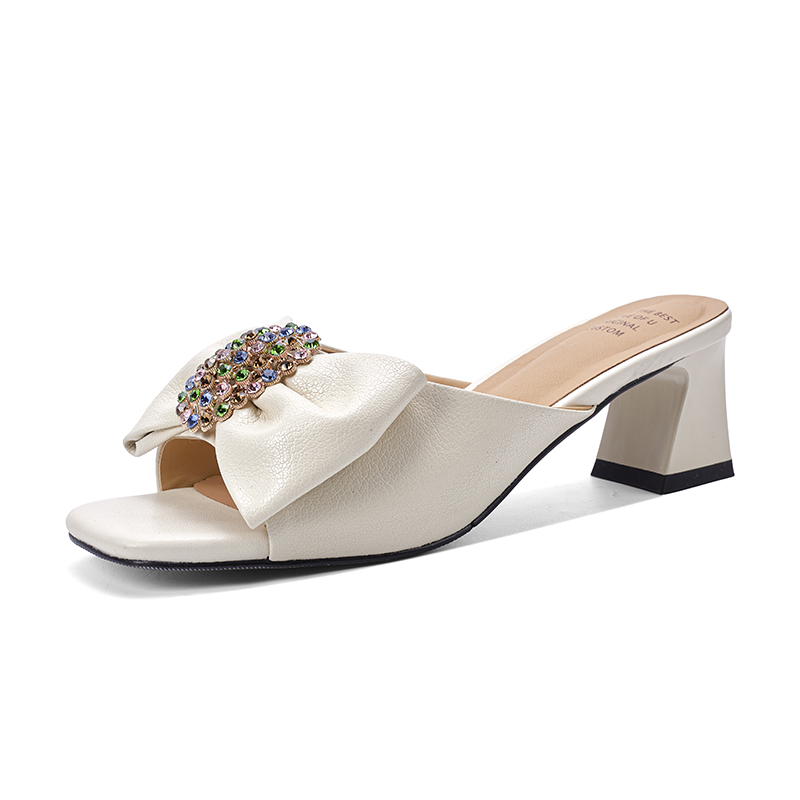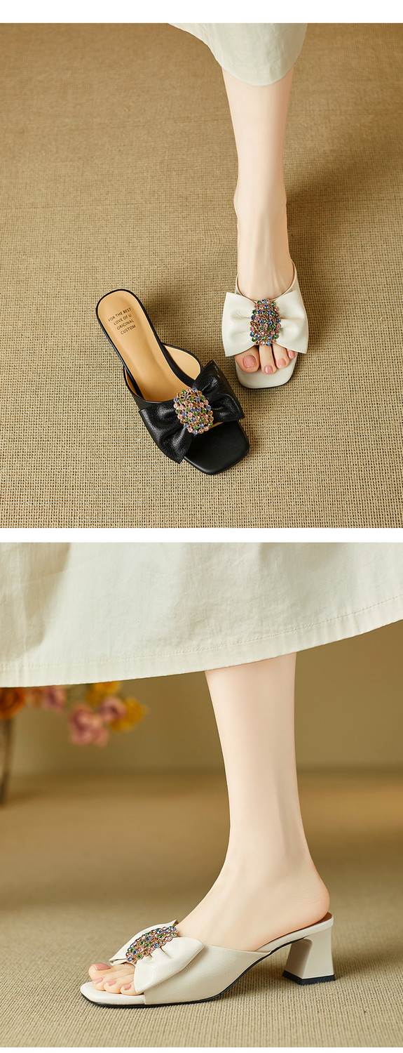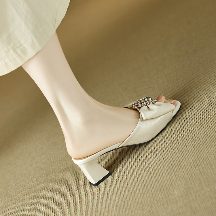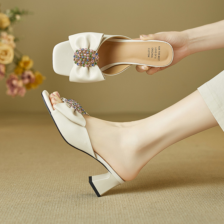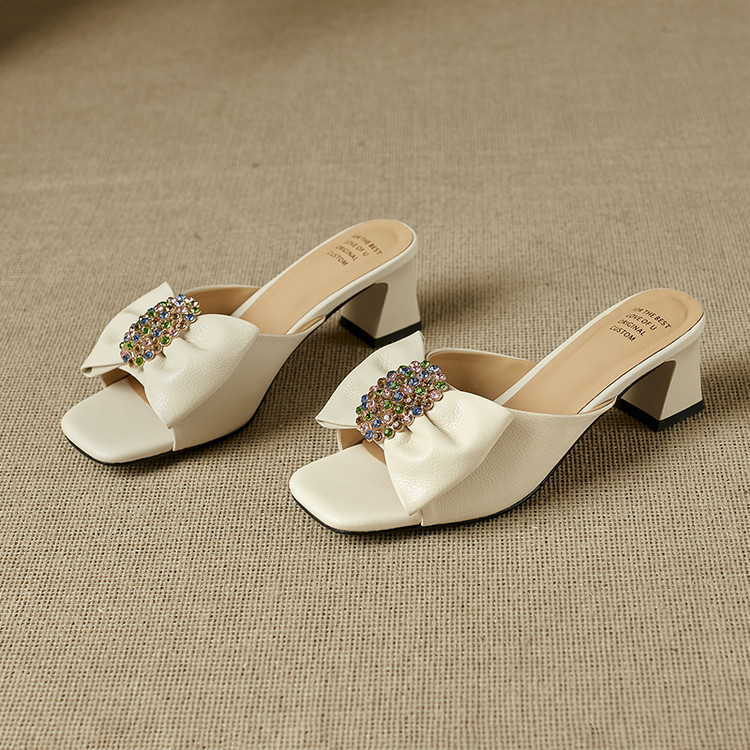 【预售5天】米白色软羊皮蝴蝶结一字带高跟拖鞋女外穿夏季软皮仙女风露趾凉鞋DSFG&1696